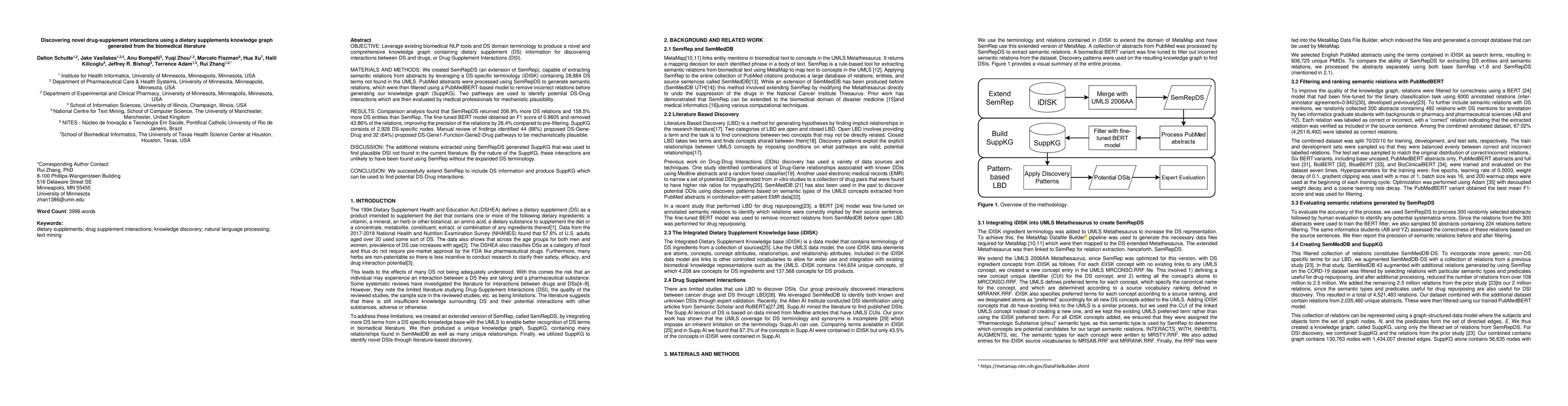 OBJECTIVE: Leverage existing biomedical NLP tools and DS domain terminology to produce a novel and comprehensive knowledge graph containing dietary supplement (DS) information for discovering interactions between DS and drugs, or Drug-Supplement Interactions (DSI). MATERIALS AND METHODS: We created SemRepDS (an extension of SemRep), capable of extracting semantic relations from abstracts by leveraging a DS-specific terminology (iDISK) containing 28,884 DS terms not found in the UMLS. PubMed abstracts were processed using SemRepDS to generate semantic relations, which were then filtered using a PubMedBERT-based model to remove incorrect relations before generating our knowledge graph (SuppKG). Two pathways are used to identify potential DS-Drug interactions which are then evaluated by medical professionals for mechanistic plausibility. RESULTS: Comparison analysis found that SemRepDS returned 206.9% more DS relations and 158.5% more DS entities than SemRep. The fine-tuned BERT model obtained an F1 score of 0.8605 and removed 43.86% of the relations, improving the precision of the relations by 26.4% compared to pre-filtering. SuppKG consists of 2,928 DS-specific nodes. Manual review of findings identified 44 (88%) proposed DS-Gene-Drug and 32 (64%) proposed DS-Gene1-Function-Gene2-Drug pathways to be mechanistically plausible. DISCUSSION: The additional relations extracted using SemRepDS generated SuppKG that was used to find plausible DSI not found in the current literature. By the nature of the SuppKG, these interactions are unlikely to have been found using SemRep without the expanded DS terminology. CONCLUSION: We successfully extend SemRep to include DS information and produce SuppKG which can be used to find potential DS-Drug interactions.