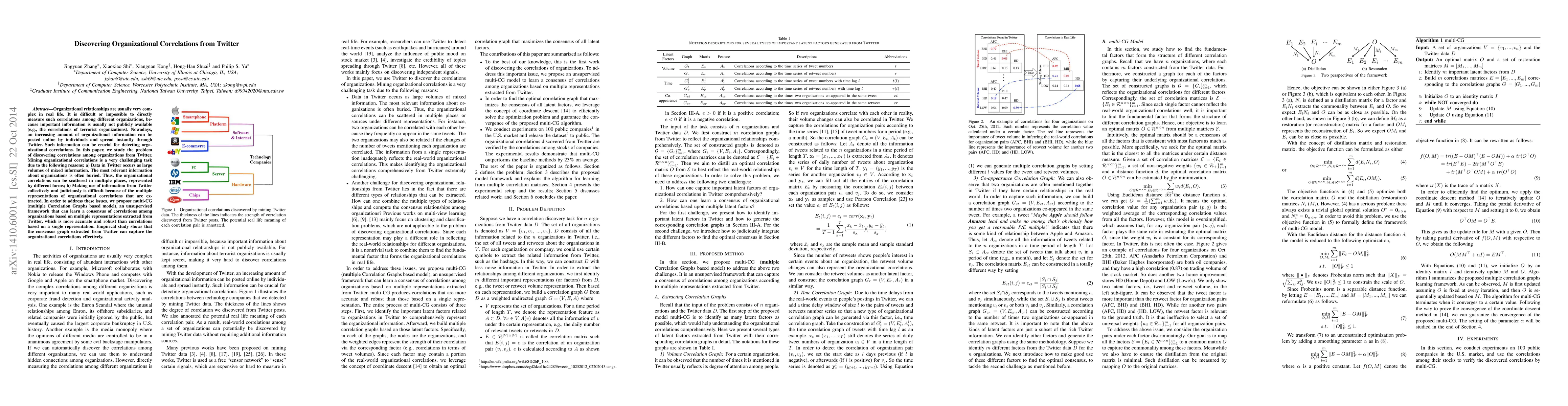 This paper proposes an unsupervised framework called multi-CG to discover organizational correlations from Twitter data, addressing the challenge of scattered and multiple representations of such information. Empirical results show that the framework can more accurately and robustly capture organizational correlations compared to single-representation methods.