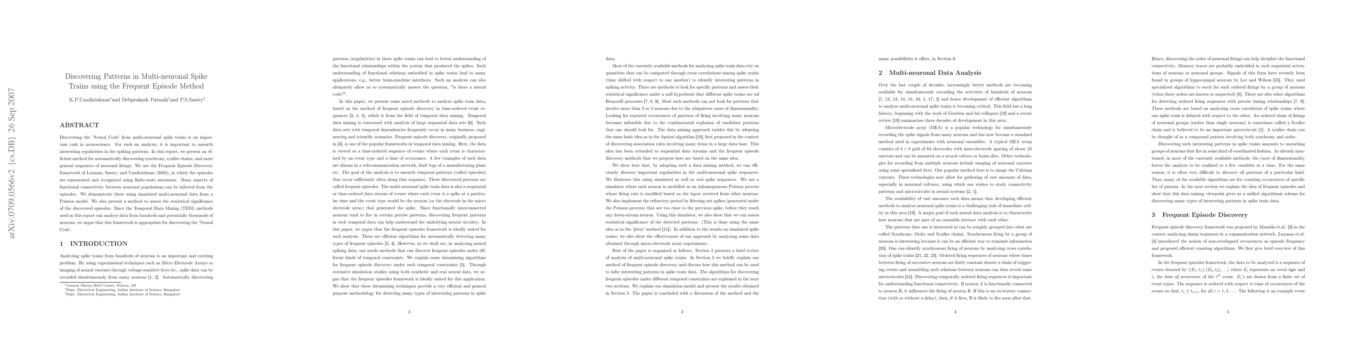 Discovering the 'Neural Code' from multi-neuronal spike trains is an important task in neuroscience. For such an analysis, it is important to unearth interesting regularities in the spiking patterns. In this report, we present an efficient method for automatically discovering synchrony, synfire chains, and more general sequences of neuronal firings. We use the Frequent Episode Discovery framework of Laxman, Sastry, and Unnikrishnan (2005), in which the episodes are represented and recognized using finite-state automata. Many aspects of functional connectivity between neuronal populations can be inferred from the episodes. We demonstrate these using simulated multi-neuronal data from a Poisson model. We also present a method to assess the statistical significance of the discovered episodes. Since the Temporal Data Mining (TDM) methods used in this report can analyze data from hundreds and potentially thousands of neurons, we argue that this framework is appropriate for discovering the `Neural Code'.