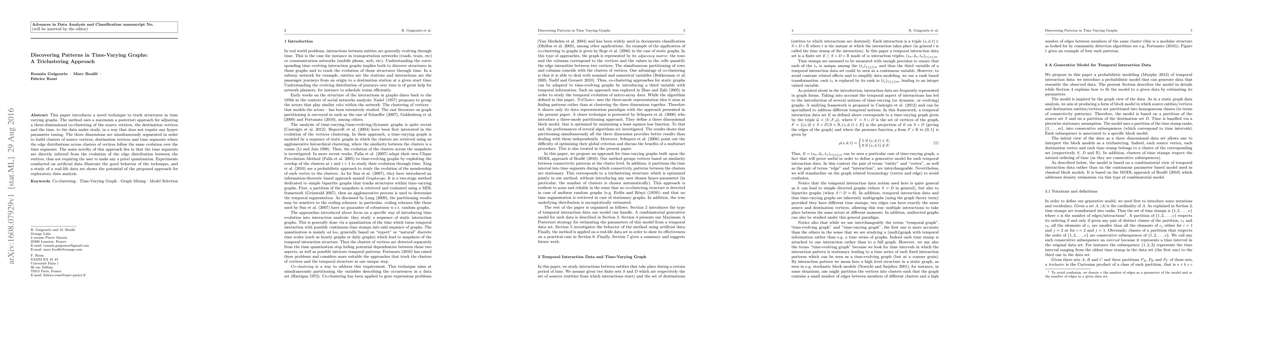 This paper introduces a novel technique to track structures in time varying graphs. The method uses a maximum a posteriori approach for adjusting a three-dimensional co-clustering of the source vertices, the destination vertices and the time, to the data under study, in a way that does not require any hyper-parameter tuning. The three dimensions are simultaneously segmented in order to build clusters of source vertices, destination vertices and time segments where the edge distributions across clusters of vertices follow the same evolution over the time segments. The main novelty of this approach lies in that the time segments are directly inferred from the evolution of the edge distribution between the vertices, thus not requiring the user to make any a priori quantization. Experiments conducted on artificial data illustrate the good behavior of the technique, and a study of a real-life data set shows the potential of the proposed approach for exploratory data analysis.