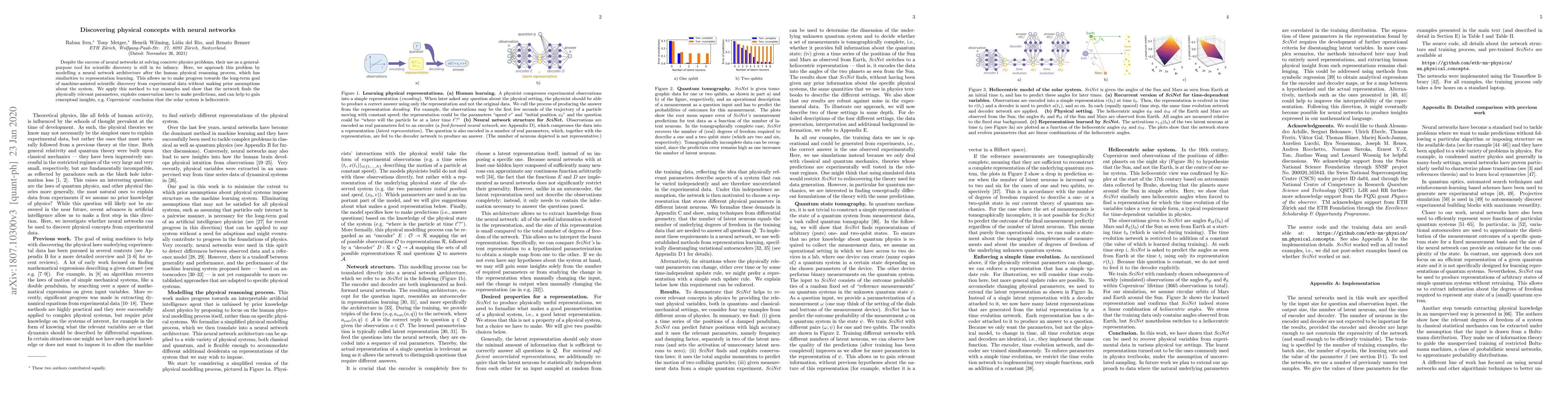 Despite the success of neural networks at solving concrete physics problems, their use as a general-purpose tool for scientific discovery is still in its infancy. Here, we approach this problem by modelling a neural network architecture after the human physical reasoning process, which has similarities to representation learning. This allows us to make progress towards the long-term goal of machine-assisted scientific discovery from experimental data without making prior assumptions about the system. We apply this method to toy examples and show that the network finds the physically relevant parameters, exploits conservation laws to make predictions, and can help to gain conceptual insights, e.g. Copernicus' conclusion that the solar system is heliocentric.