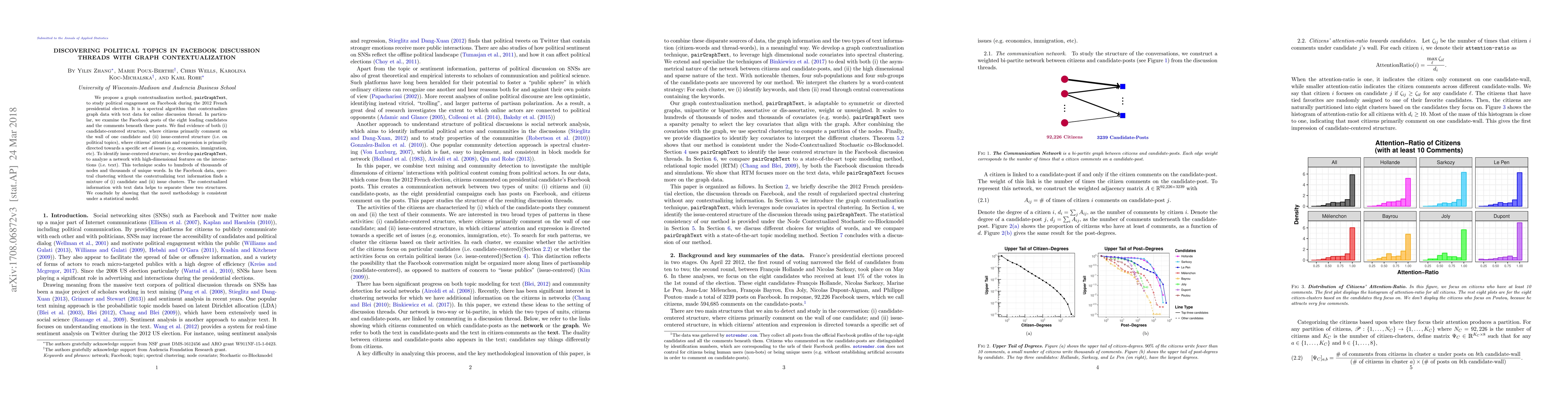 We propose a graph contextualization method, pairGraphText, to study political engagement on Facebook during the 2012 French presidential election. It is a spectral algorithm that contextualizes graph data with text data for online discussion thread. In particular, we examine the Facebook posts of the eight leading candidates and the comments beneath these posts. We find evidence of both (i) candidate-centered structure, where citizens primarily comment on the wall of one candidate and (ii) issue-centered structure (i.e. on political topics), where citizens' attention and expression is primarily directed towards a specific set of issues (e.g. economics, immigration, etc). To identify issue-centered structure, we develop pairGraphText, to analyze a network with high-dimensional features on the interactions (i.e. text). This technique scales to hundreds of thousands of nodes and thousands of unique words. In the Facebook data, spectral clustering without the contextualizing text information finds a mixture of (i) candidate and (ii) issue clusters. The contextualized information with text data helps to separate these two structures. We conclude by showing that the novel methodology is consistent under a statistical model.