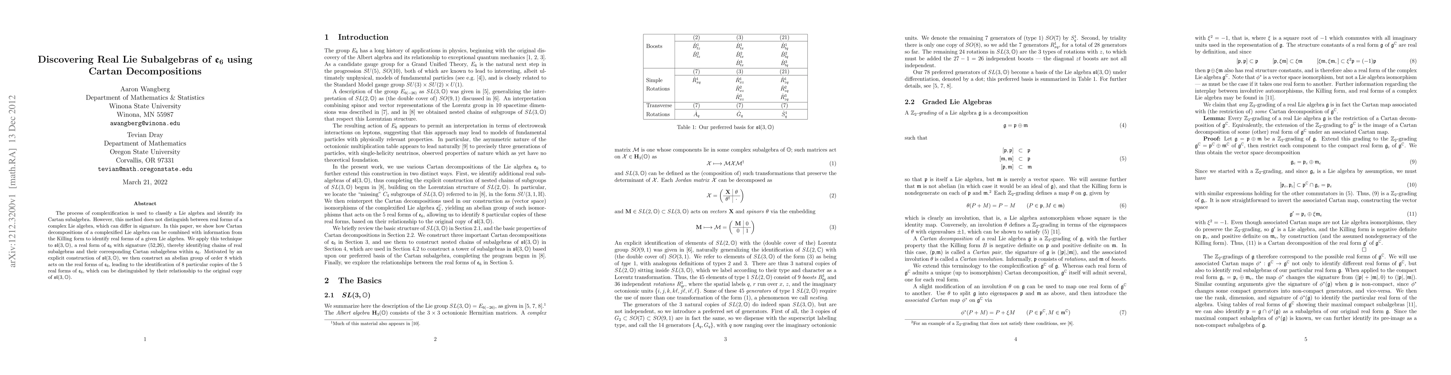 The process of complexification is used to classify a Lie algebra and identify its Cartan subalgebra. However, this method does not distinguish between real forms of a complex Lie algebra, which can differ in signature. In this paper, we show how Cartan decompositions of a complexified Lie algebra can be combined with information from the Killing form to identify real forms of a given Lie algebra. We apply this technique to sl(3,O), a real form of e6 with signature (52,26), thereby identifying chains of real subalgebras and their corresponding Cartan subalgebras within e6. Motivated by an explicit construction of sl(3,O), we then construct an abelian group of order 8 which acts on the real forms of e6, leading to the identification of 8 particular copies of the 5 real forms of e6, which can be distinguished by their relationship to the original copy of sl(3,O).