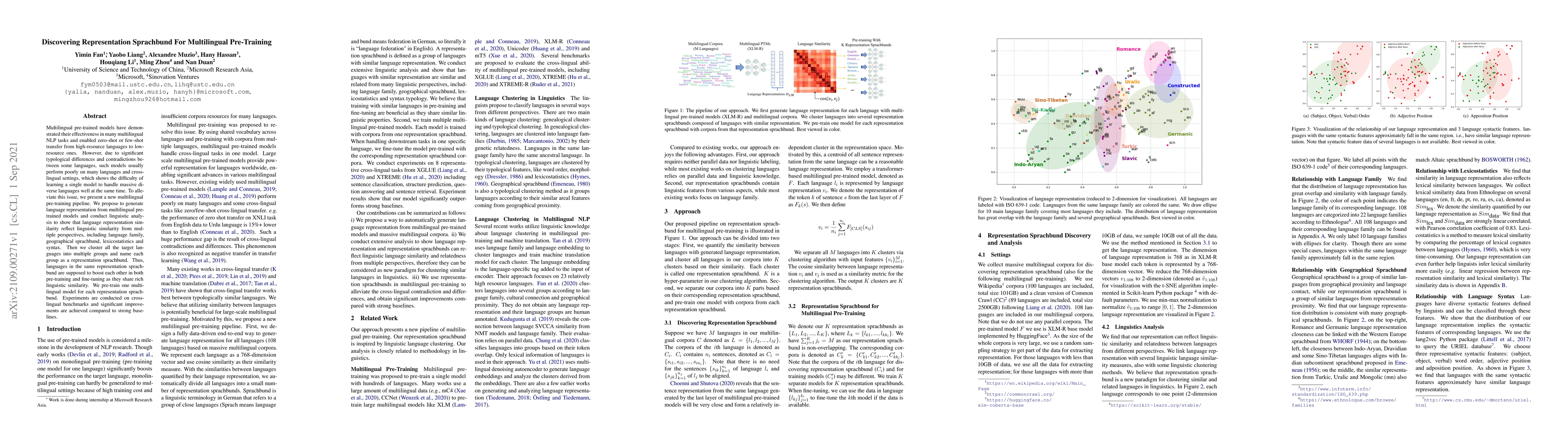 Multilingual pre-trained models have demonstrated their effectiveness in many multilingual NLP tasks and enabled zero-shot or few-shot transfer from high-resource languages to low resource ones. However, due to significant typological differences and contradictions between some languages, such models usually perform poorly on many languages and cross-lingual settings, which shows the difficulty of learning a single model to handle massive diverse languages well at the same time. To alleviate this issue, we present a new multilingual pre-training pipeline. We propose to generate language representation from multilingual pre-trained models and conduct linguistic analysis to show that language representation similarity reflect linguistic similarity from multiple perspectives, including language family, geographical sprachbund, lexicostatistics and syntax. Then we cluster all the target languages into multiple groups and name each group as a representation sprachbund. Thus, languages in the same representation sprachbund are supposed to boost each other in both pre-training and fine-tuning as they share rich linguistic similarity. We pre-train one multilingual model for each representation sprachbund. Experiments are conducted on cross-lingual benchmarks and significant improvements are achieved compared to strong baselines.