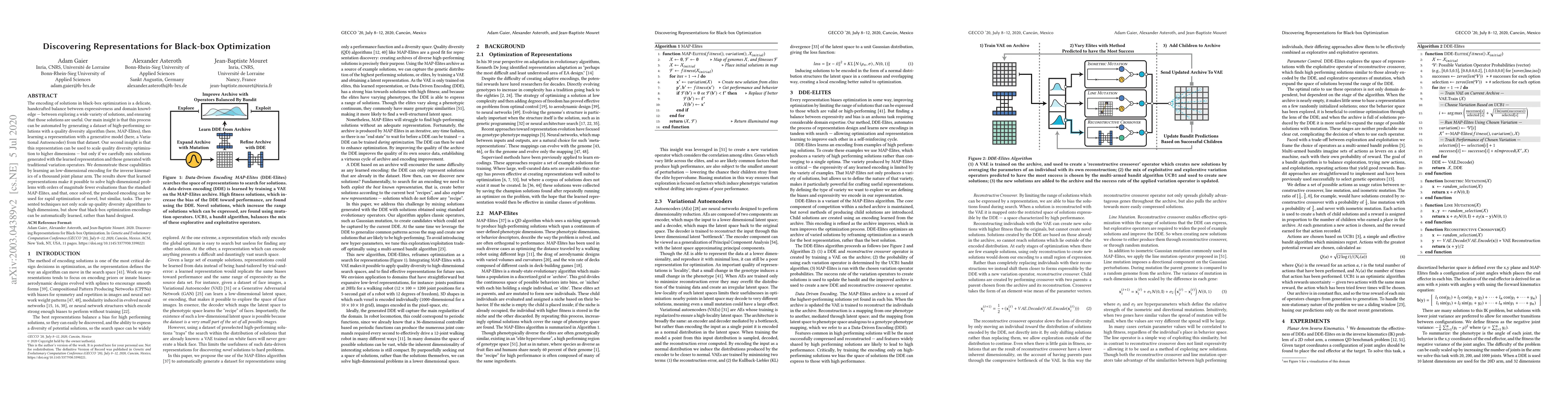 The encoding of solutions in black-box optimization is a delicate, handcrafted balance between expressiveness and domain knowledge -- between exploring a wide variety of solutions, and ensuring that those solutions are useful. Our main insight is that this process can be automated by generating a dataset of high-performing solutions with a quality diversity algorithm (here, MAP-Elites), then learning a representation with a generative model (here, a Variational Autoencoder) from that dataset. Our second insight is that this representation can be used to scale quality diversity optimization to higher dimensions -- but only if we carefully mix solutions generated with the learned representation and those generated with traditional variation operators. We demonstrate these capabilities by learning an low-dimensional encoding for the inverse kinematics of a thousand joint planar arm. The results show that learned representations make it possible to solve high-dimensional problems with orders of magnitude fewer evaluations than the standard MAP-Elites, and that, once solved, the produced encoding can be used for rapid optimization of novel, but similar, tasks. The presented techniques not only scale up quality diversity algorithms to high dimensions, but show that black-box optimization encodings can be automatically learned, rather than hand designed.