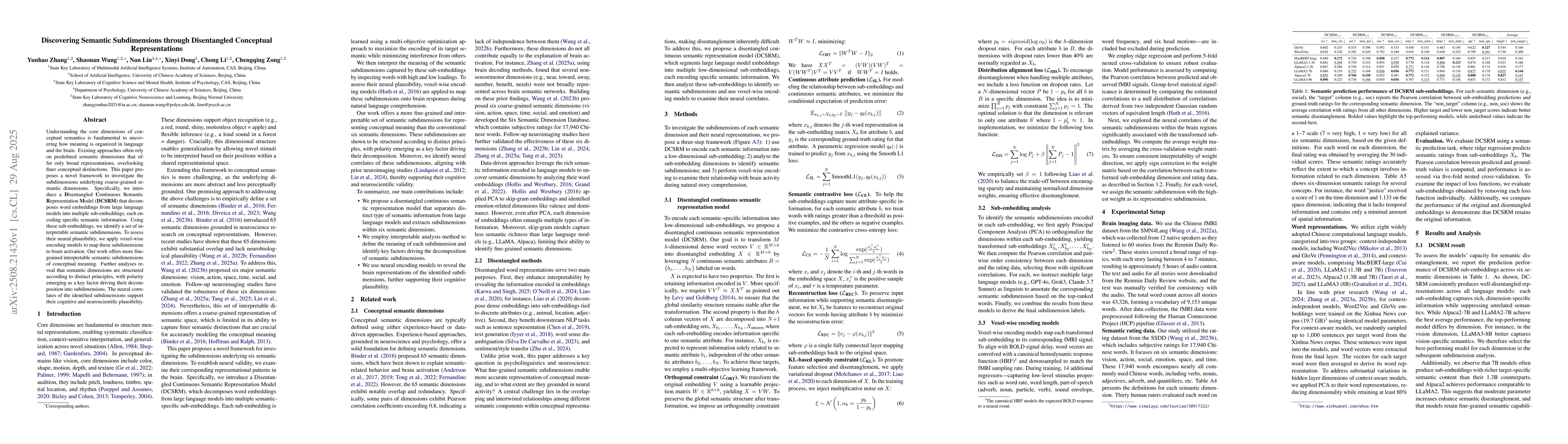 Understanding the core dimensions of conceptual semantics is fundamental to uncovering how meaning is organized in language and the brain. Existing approaches often rely on predefined semantic dimensions that offer only broad representations, overlooking finer conceptual distinctions. This paper proposes a novel framework to investigate the subdimensions underlying coarse-grained semantic dimensions. Specifically, we introduce a Disentangled Continuous Semantic Representation Model (DCSRM) that decomposes word embeddings from large language models into multiple sub-embeddings, each encoding specific semantic information. Using these sub-embeddings, we identify a set of interpretable semantic subdimensions. To assess their neural plausibility, we apply voxel-wise encoding models to map these subdimensions to brain activation. Our work offers more fine-grained interpretable semantic subdimensions of conceptual meaning. Further analyses reveal that semantic dimensions are structured according to distinct principles, with polarity emerging as a key factor driving their decomposition into subdimensions. The neural correlates of the identified subdimensions support their cognitive and neuroscientific plausibility.