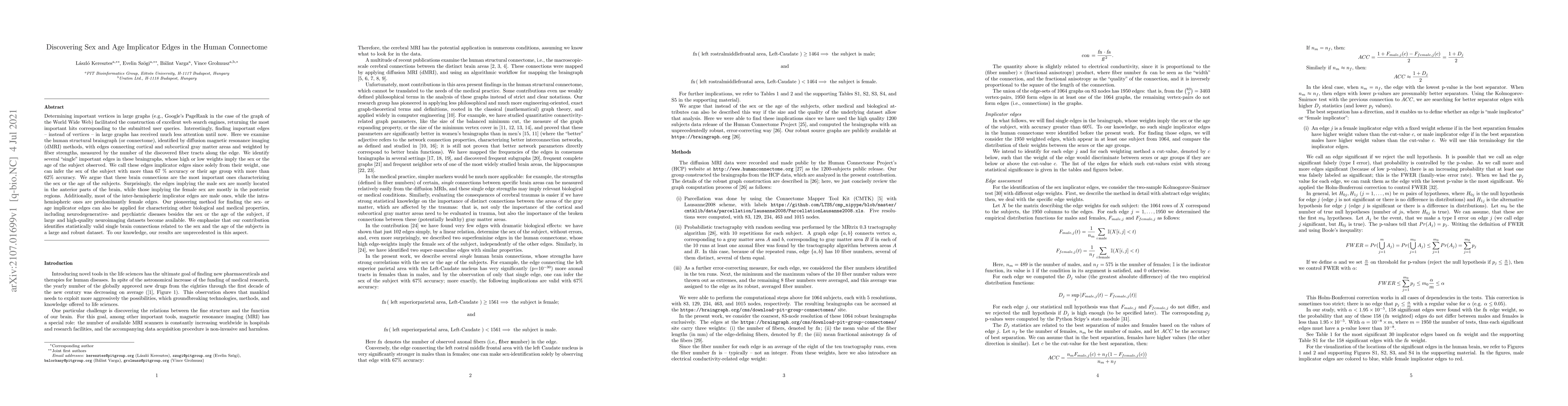 This research identifies significant "implicator edges" in the human connectome that can infer the sex or age of individuals based on the strength of brain connections, with high accuracy. The study reveals distinct regional patterns in the brain where these edges are located, suggesting potential implications for understanding biological and medical properties.