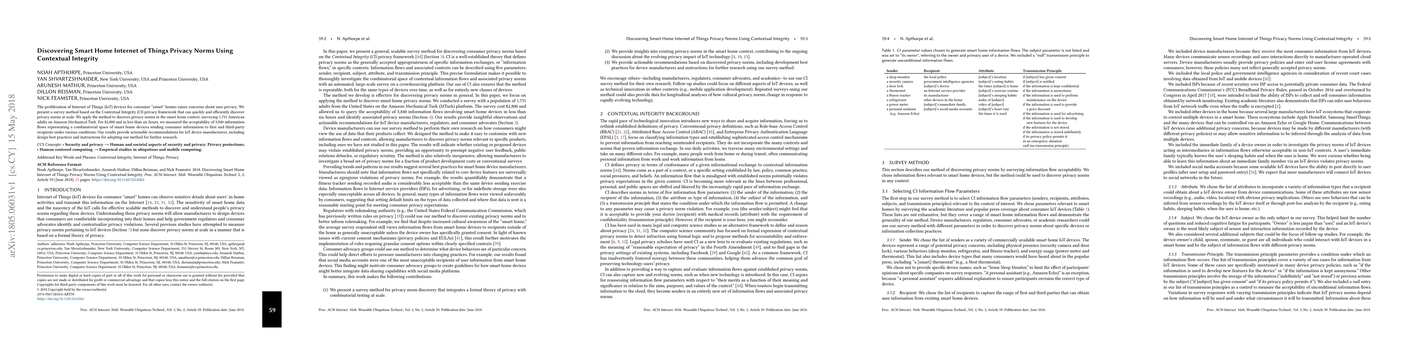 This paper introduces a survey method based on Contextual Integrity to identify privacy norms for smart home IoT devices. The study surveyed 1,731 American adults to assess the acceptability of 3,840 information flows, providing actionable recommendations for IoT manufacturers.