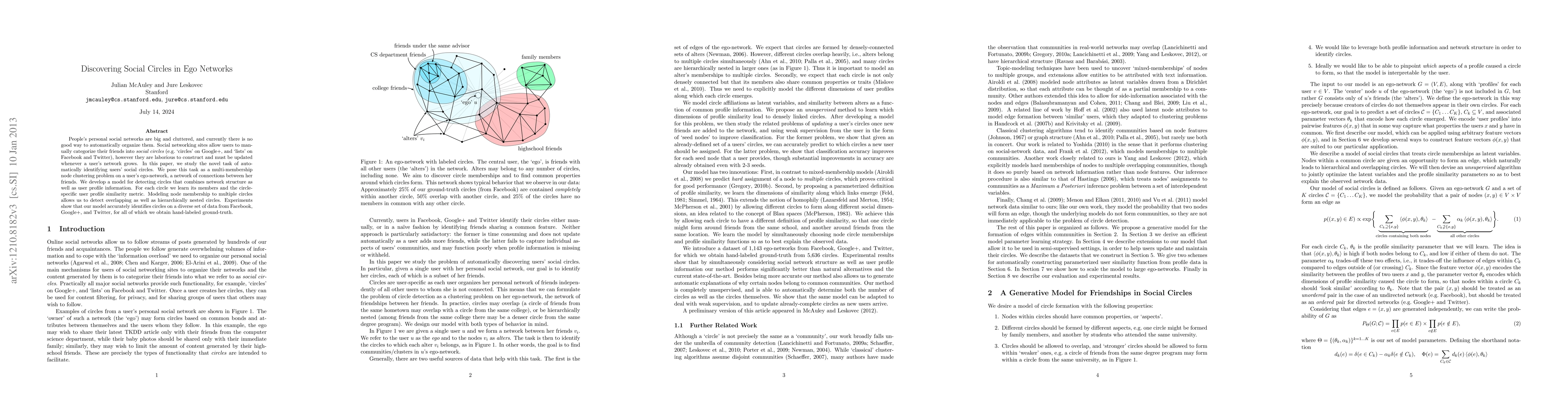 This paper proposes a method to automatically identify social circles in users' ego networks by clustering nodes based on both network structure and user profile information. The model detects overlapping and nested circles, demonstrating accuracy across data from Facebook, Google+, and Twitter.