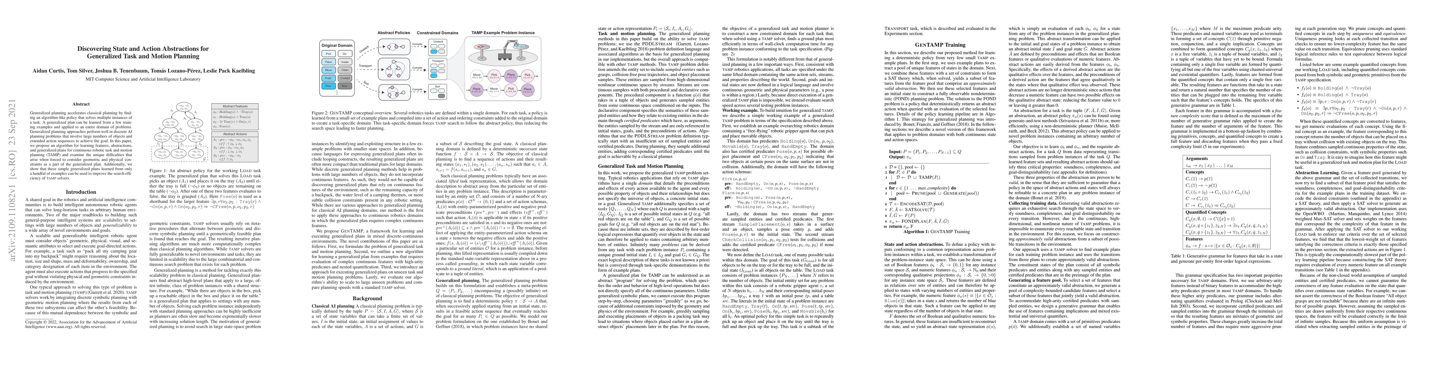 This paper proposes an algorithm to learn features and abstractions for generalized task and motion planning in continuous robotics, addressing the unique challenges posed by geometric and physical constraints. It demonstrates that these generalized plans, derived from limited examples, can enhance the efficiency of traditional task and motion planning solvers.