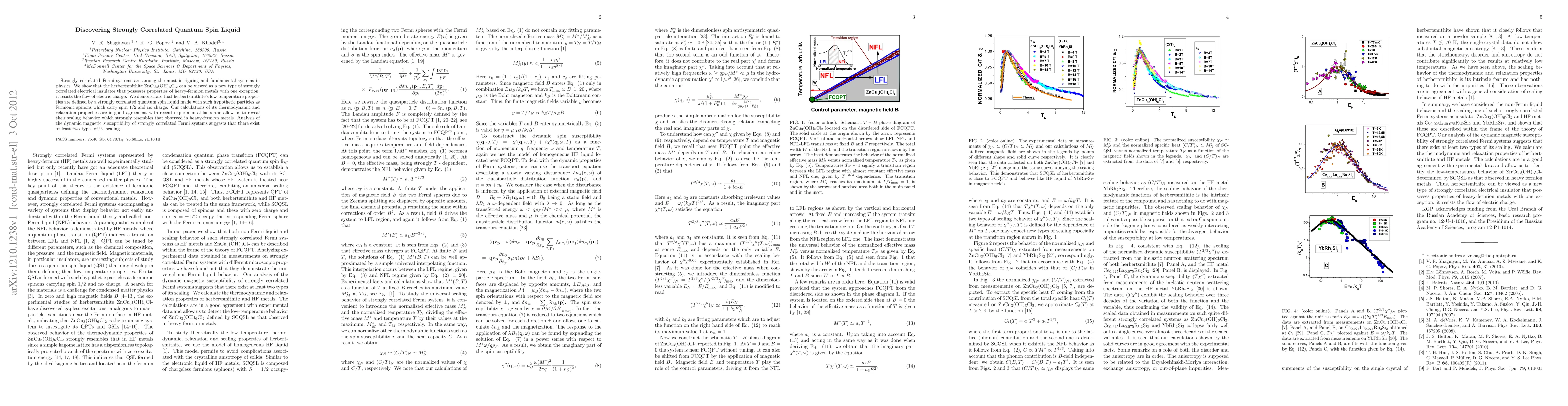 Title: Discovering Strongly Correlated Quantum Spin Liquid Summary: This paper identifies herbertsmithite as a novel strongly correlated quantum spin liquid that exhibits heavy-fermion metal-like properties except for being an electrical insulator, defined by fermionic spinons, and demonstrates its thermodynamic and relaxation behaviors that parallel those of heavy-fermion metals.