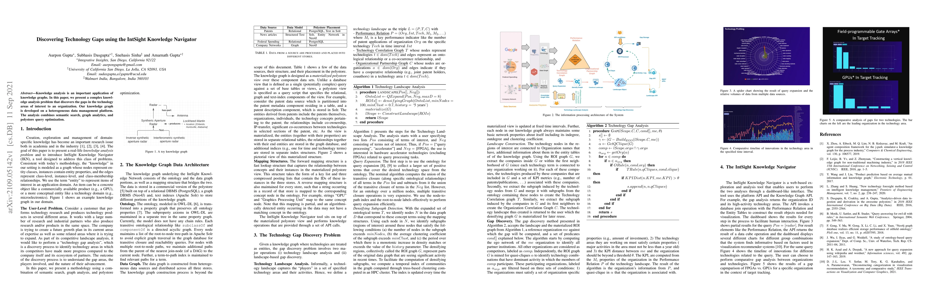 This paper introduces IntSight, a tool using knowledge graphs to identify technology gaps for organizations. It combines semantic search, graph analytics, and polystore query optimization on a heterogeneous data management platform.