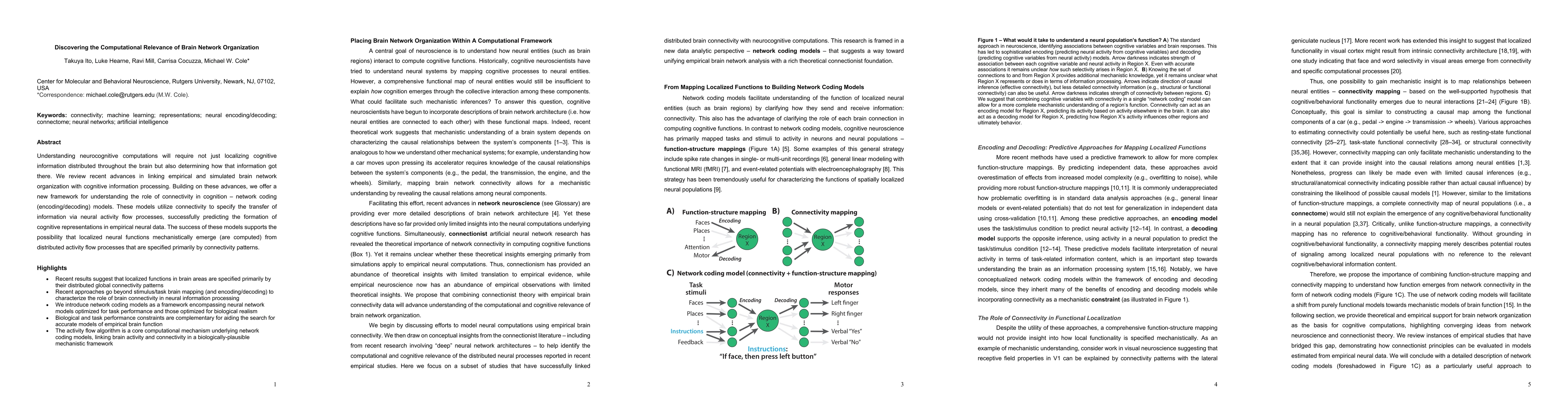 Understanding neurocognitive computations will require not just localizing cognitive information distributed throughout the brain but also determining how that information got there. We review recent advances in linking empirical and simulated brain network organization with cognitive information processing. Building on these advances, we offer a new framework for understanding the role of connectivity in cognition - network coding (encoding/decoding) models. These models utilize connectivity to specify the transfer of information via neural activity flow processes, successfully predicting the formation of cognitive representations in empirical neural data. The success of these models supports the possibility that localized neural functions mechanistically emerge (are computed) from distributed activity flow processes that are specified primarily by connectivity patterns.
