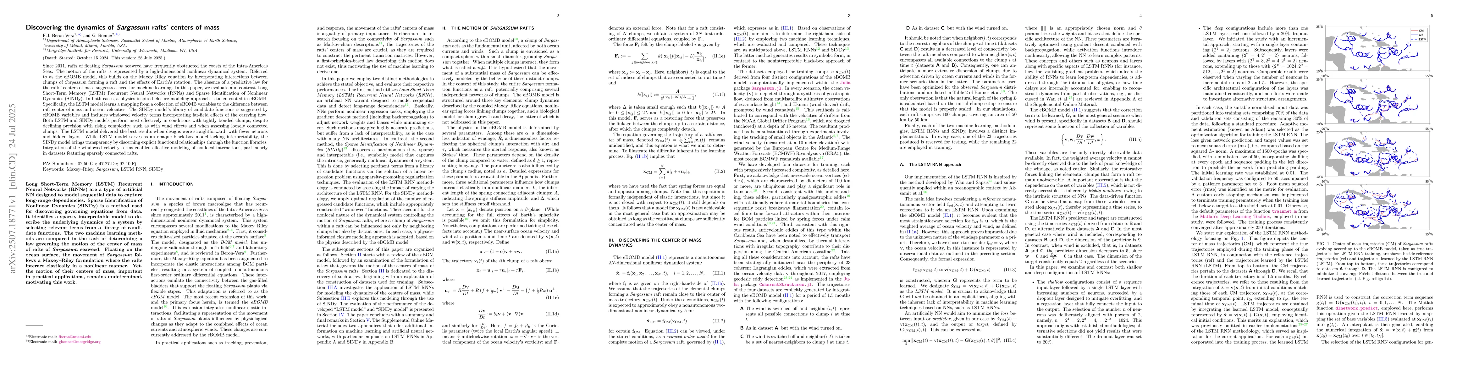 Since 2011, rafts of floating \emph{Sargassum} seaweed have frequently obstructed the coasts of the Intra-Americas Seas. The motion of the rafts is represented by a high-dimensional nonlinear dynamical system. Referred to as the eBOMB model, this builds on the Maxey--Riley equation by incorporating interactions between clumps of \emph{Sargassum} forming a raft and the effects of Earth's rotation. The absence of a predictive law for the rafts' centers of mass suggests a need for machine learning. In this paper, we evaluate and contrast Long Short-Term Memory (LSTM) Recurrent Neural Networks (RNNs) and Sparse Identification of Nonlinear Dynamics (SINDy). In both cases, a physics-inspired closure modeling approach is taken rooted in eBOMB. Specifically, the LSTM model learns a mapping from a collection of eBOMB variables to the difference between raft center-of-mass and ocean velocities. The SINDy model's library of candidate functions is suggested by eBOMB variables and includes windowed velocity terms incorporating far-field effects of the carrying flow. Both LSTM and SINDy models perform most effectively in conditions with tightly bonded clumps, despite declining precision with rising complexity, such as with wind effects and when assessing loosely connected clumps. The LSTM model delivered the best results when designs were straightforward, with fewer neurons and hidden layers. While LSTM model serves as an opaque black-box model lacking interpretability, the SINDy model brings transparency by discerning explicit functional relationships through the function libraries. Integration of the windowed velocity terms enabled effective modeling of nonlocal interactions, particularly in datasets featuring sparsely connected rafts.