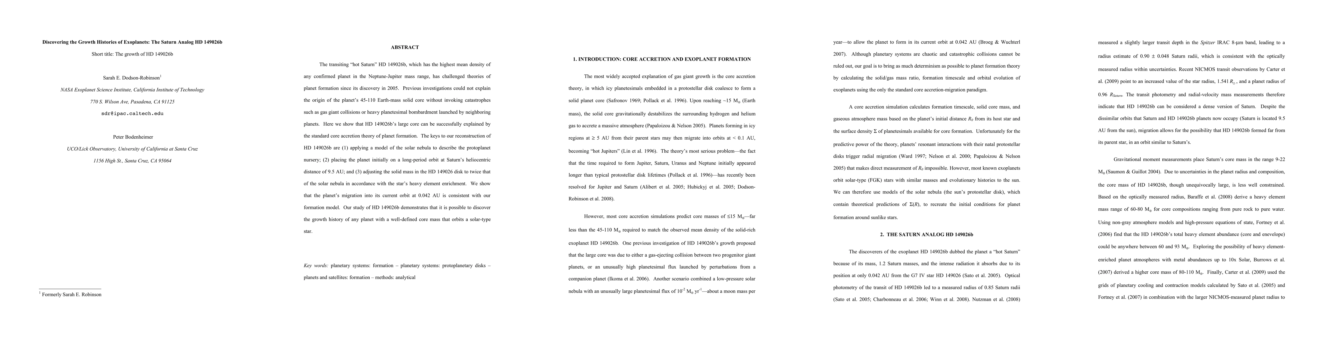 This paper explores the formation history of the "hot Saturn" HD 149026b, explaining its large core through standard core accretion theory, using a model of the solar nebula, initial long-period orbit, and increased solid mass in the protoplanetary disk. The study concludes that HD 149026b's migration aligns with this model, offering a method to reconstruct the growth history of similar exoplanets.