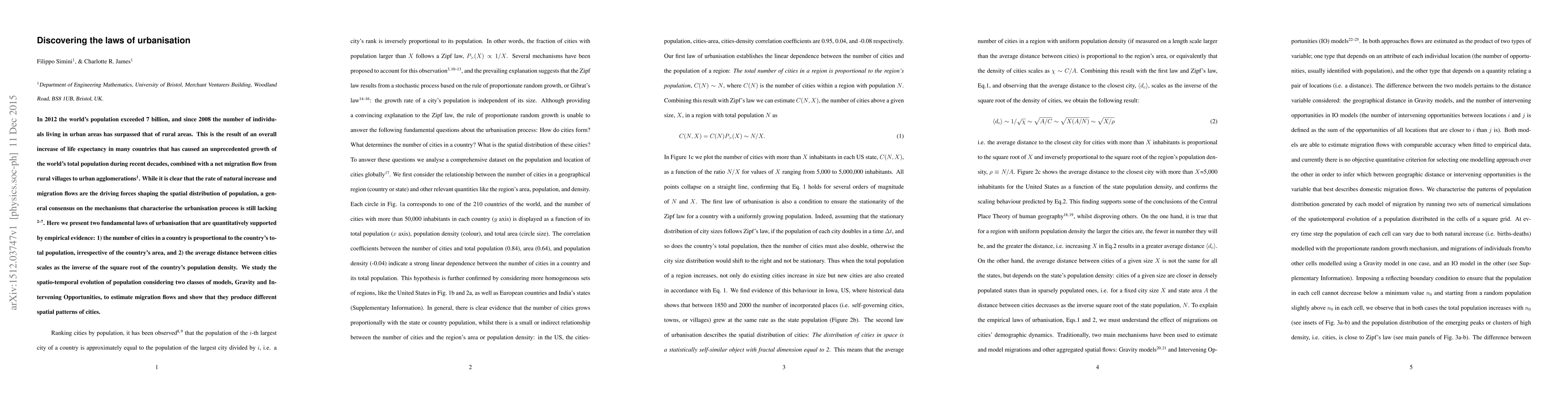 In 2012 the world's population exceeded 7 billion, and since 2008 the number of individuals living in urban areas has surpassed that of rural areas. This is the result of an overall increase of life expectancy in many countries that has caused an unprecedented growth of the world's total population during recent decades, combined with a net migration flow from rural villages to urban agglomerations. While it is clear that the rate of natural increase and migration flows are the driving forces shaping the spatial distribution of population, a general consensus on the mechanisms that characterise the urbanisation process is still lacking. Here we present two fundamental laws of urbanisation that are quantitatively supported by empirical evidence: 1) the number of cities in a country is proportional to the country's total population, irrespective of the country's area, and 2) the average distance between cities scales as the inverse of the square root of the country's population density. We study the spatio-temporal evolution of population considering two classes of models, Gravity and Intervening Opportunities, to estimate migration flows and show that they produce different spatial patterns of cities.