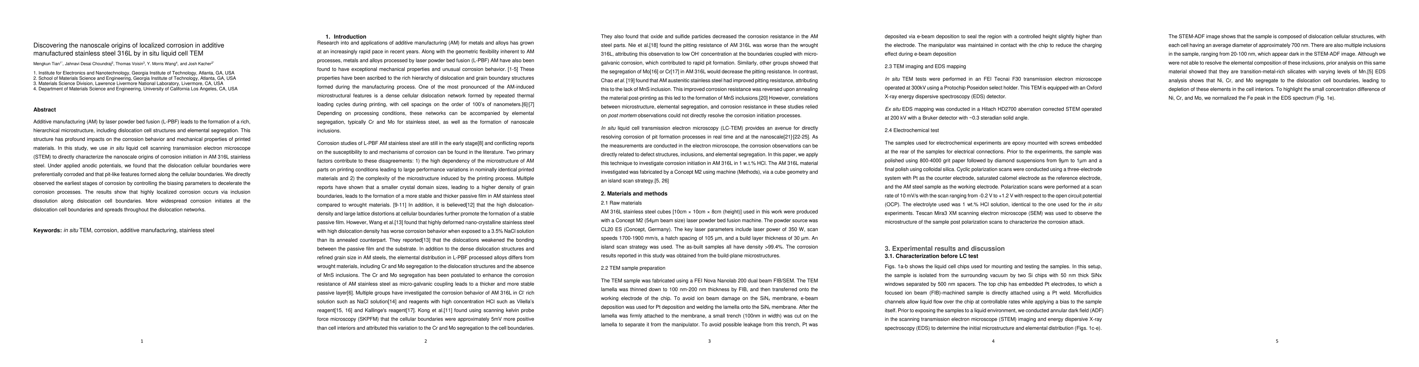 This study uses in situ liquid cell STEM to investigate the nanoscale origins of localized corrosion in additively manufactured 316L stainless steel, revealing that dislocation cellular boundaries are preferentially corroded, initiating highly localized corrosion via inclusion dissolution. Widespread corrosion follows, spreading through dislocation networks.