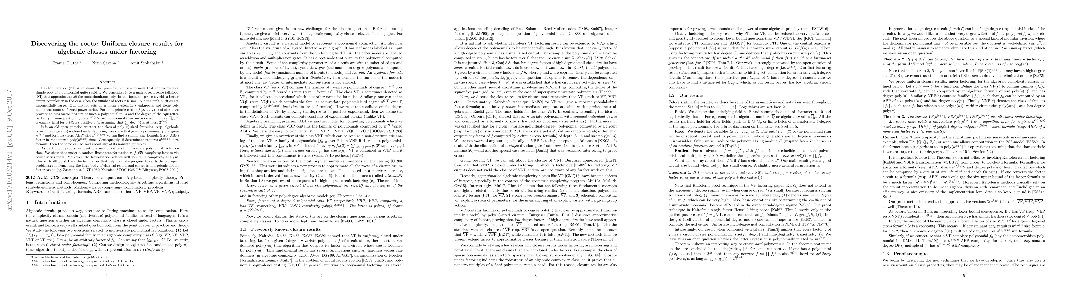 Newton iteration (NI) is an almost 350 years old recursive formula that approximates a simple root of a polynomial quite rapidly. We generalize it to a matrix recurrence (allRootsNI) that approximates all the roots simultaneously. In this form, the process yields a better circuit complexity in the case when the number of roots $r$ is small but the multiplicities are exponentially large. Our method sets up a linear system in $r$ unknowns and iteratively builds the roots as formal power series. For an algebraic circuit $f(x_1,\ldots,x_n)$ of size $s$ we prove that each factor has size at most a polynomial in: $s$ and the degree of the squarefree part of $f$. Consequently, if $f_1$ is a $2^{\Omega(n)}$-hard polynomial then any nonzero multiple $\prod_{i} f_i^{e_i}$ is equally hard for arbitrary positive $e_i$'s, assuming that $\sum_i \text{deg}(f_i)$ is at most $2^{O(n)}$. It is an old open question whether the class of poly($n$)-sized formulas (resp. algebraic branching programs) is closed under factoring. We show that given a polynomial $f$ of degree $n^{O(1)}$ and formula (resp. ABP) size $n^{O(\log n)}$ we can find a similar size formula (resp. ABP) factor in randomized poly($n^{\log n}$)-time. Consequently, if determinant requires $n^{\Omega(\log n)}$ size formula, then the same can be said about any of its nonzero multiples. As part of our proofs, we identify a new property of multivariate polynomial factorization. We show that under a random linear transformation $\tau$, $f(\tau\overline{x})$ completely factors via power series roots. Moreover, the factorization adapts well to circuit complexity analysis. This with allRootsNI are the techniques that help us make progress towards the old open problems, supplementing the large body of classical results and concepts in algebraic circuit factorization (eg. Zassenhaus, J.NT 1969, Kaltofen, STOC 1985-7 \& Burgisser, FOCS 2001).