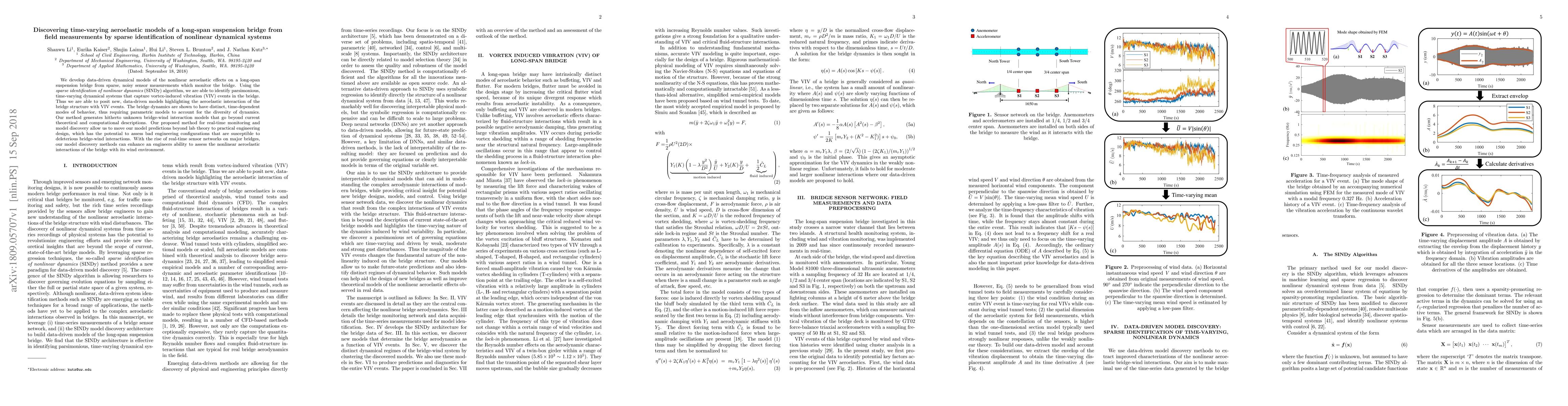 We develop data-driven dynamical models of the nonlinear aeroelastic effects on a long-span suspension bridge from sparse, noisy sensor measurements which monitor the bridge. Using the {\em sparse identification of nonlinear dynamics} (SINDy) algorithm, we are able to identify parsimonious, time-varying dynamical systems that capture vortex-induced vibration (VIV) events in the bridge. Thus we are able to posit new, data-driven models highlighting the aeroelastic interaction of the bridge structure with VIV events. The bridge dynamics are shown to have distinct, time-dependent modes of behavior, thus requiring parametric models to account for the diversity of dynamics. Our method generates hitherto unknown bridge-wind interaction models that go beyond current theoretical and computational descriptions. Our proposed method for real-time monitoring and model discovery allow us to move our model predictions beyond lab theory to practical engineering design, which has the potential to assess bad engineering configurations that are susceptible to deleterious bridge-wind interactions. With the rise of real-time sensor networks on major bridges, our model discovery methods can enhance an engineers ability to assess the nonlinear aeroelastic interactions of the bridge with its wind environment.