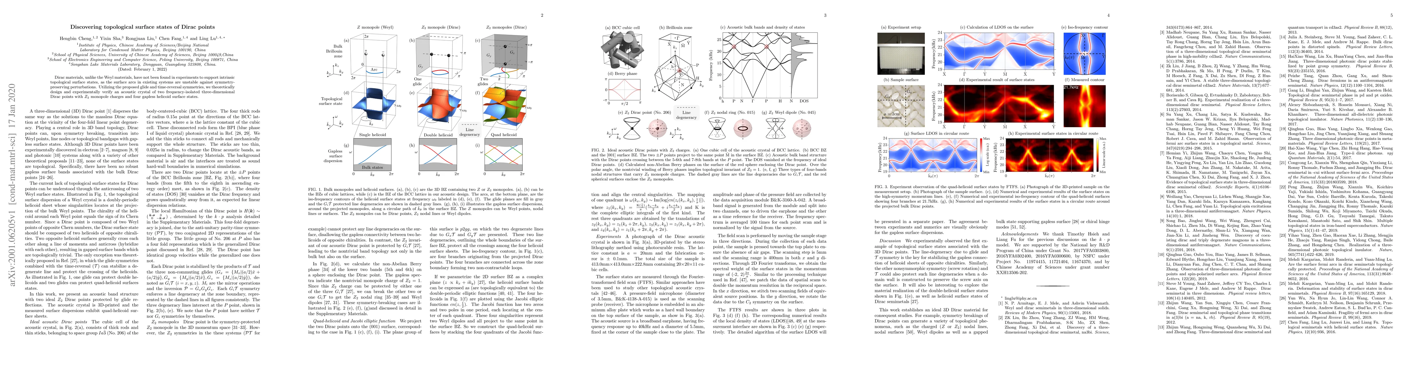 Dirac materials, unlike the Weyl materials, have not been found in experiments to support intrinsic topological surface states, as the surface arcs in existing systems are unstable against symmetry-preserving perturbations. Utilizing the proposed glide and time-reversal symmetries, we theoretically design and experimentally verify an acoustic crystal of two frequency-isolated three-dimensional Dirac points with $Z_2$ monopole charges and four gapless helicoid surface states.