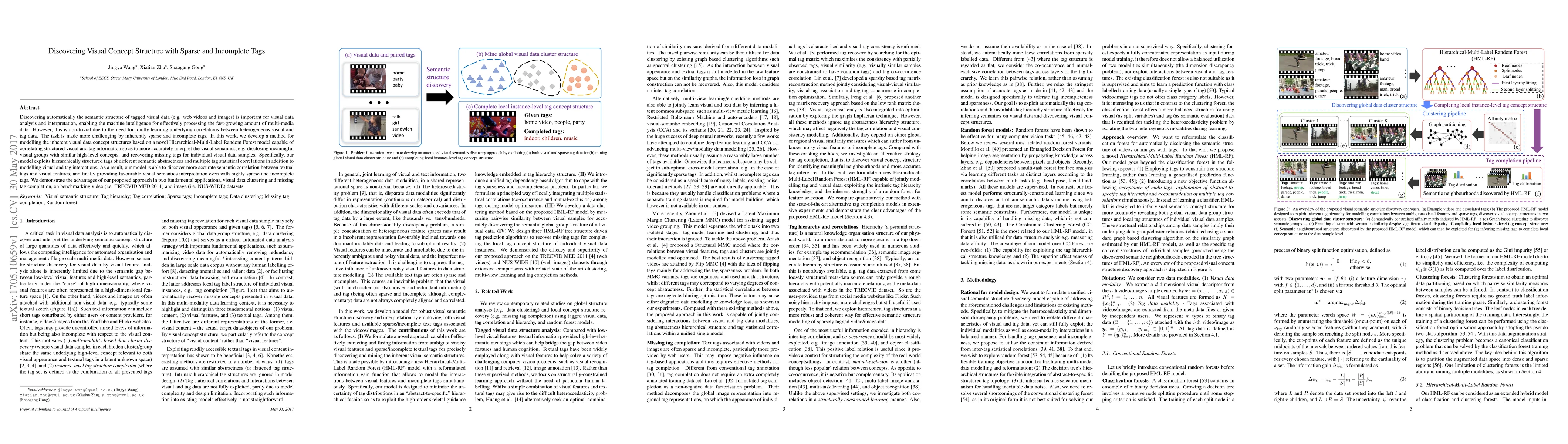 This paper proposes a Hierarchical-Multi-Label Random Forest model to discover the semantic structure of tagged visual data, enabling better interpretation of visual semantics despite sparse and incomplete tags. The model correlates structured visual and tag information to accurately interpret visual semantics and recover missing tags, demonstrated through visual data clustering and missing tag completion on video and image datasets.