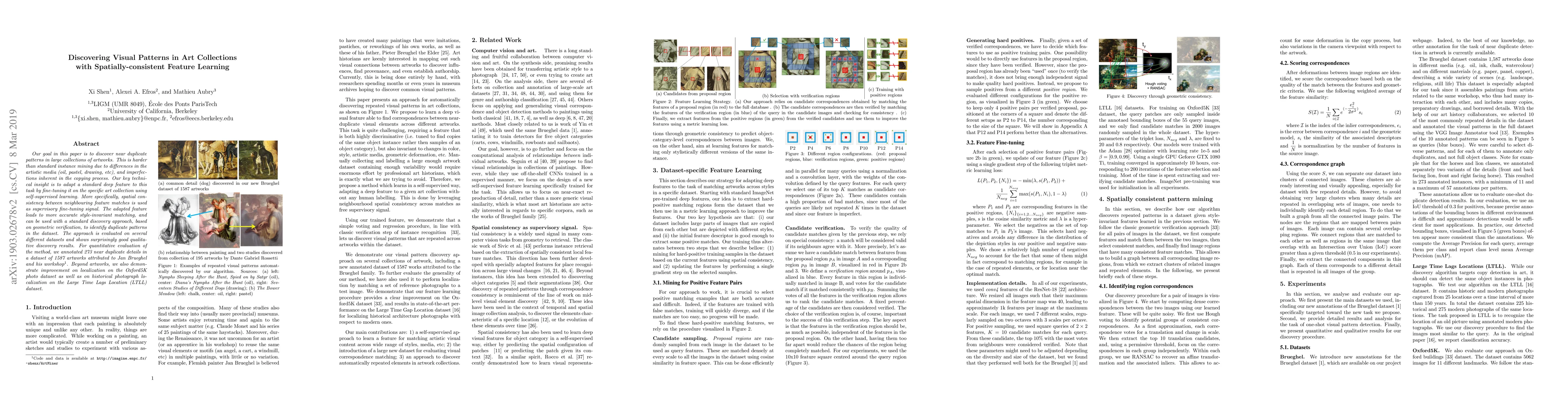 Our goal in this paper is to discover near duplicate patterns in large collections of artworks. This is harder than standard instance mining due to differences in the artistic media (oil, pastel, drawing, etc), and imperfections inherent in the copying process. The key technical insight is to adapt a standard deep feature to this task by fine-tuning it on the specific art collection using self-supervised learning. More specifically, spatial consistency between neighbouring feature matches is used as supervisory fine-tuning signal. The adapted feature leads to more accurate style-invariant matching, and can be used with a standard discovery approach, based on geometric verification, to identify duplicate patterns in the dataset. The approach is evaluated on several different datasets and shows surprisingly good qualitative discovery results. For quantitative evaluation of the method, we annotated 273 near duplicate details in a dataset of 1587 artworks attributed to Jan Brueghel and his workshop. Beyond artwork, we also demonstrate improvement on localization on the Oxford5K photo dataset as well as on historical photograph localization on the Large Time Lags Location (LTLL) dataset.