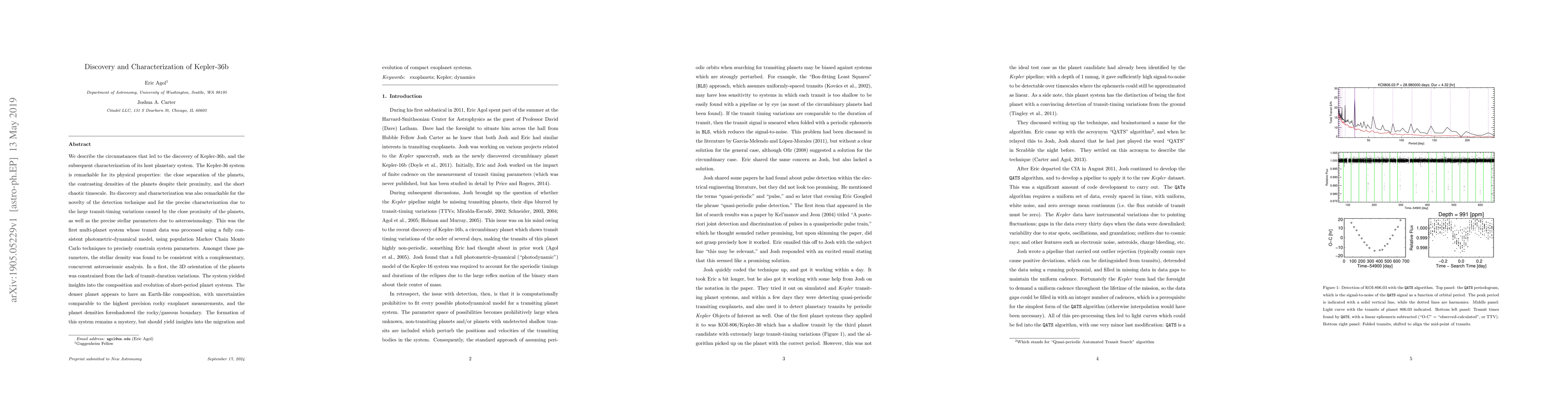 We describe the circumstances that led to the discovery of Kepler-36b, and the subsequent characterization of its host planetary system. The Kepler-36 system is remarkable for its physical properties: the close separation of the planets, the contrasting densities of the planets despite their proximity, and the short chaotic timescale. Its discovery and characterization was also remarkable for the novelty of the detection technique and for the precise characterization due to the large transit-timing variations caused by the close proximity of the planets, as well as the precise stellar parameters due to asteroseismology. This was the first multi-planet system whose transit data was processed using a fully consistent photometric-dynamical model, using population Markov Chain Monte Carlo techniques to precisely constrain system parameters. Amongst those parameters, the stellar density was found to be consistent with a complementary, concurrent asteroseismic analysis. In a first, the 3D orientation of the planets was constrained from the lack of transit-duration variations. The system yielded insights into the composition and evolution of short-period planet systems. The denser planet appears to have an Earth-like composition, with uncertainties comparable to the highest precision rocky exoplanet measurements, and the planet densities foreshadowed the rocky/gaseous boundary. The formation of this system remains a mystery, but should yield insights into the migration and evolution of compact exoplanet systems.