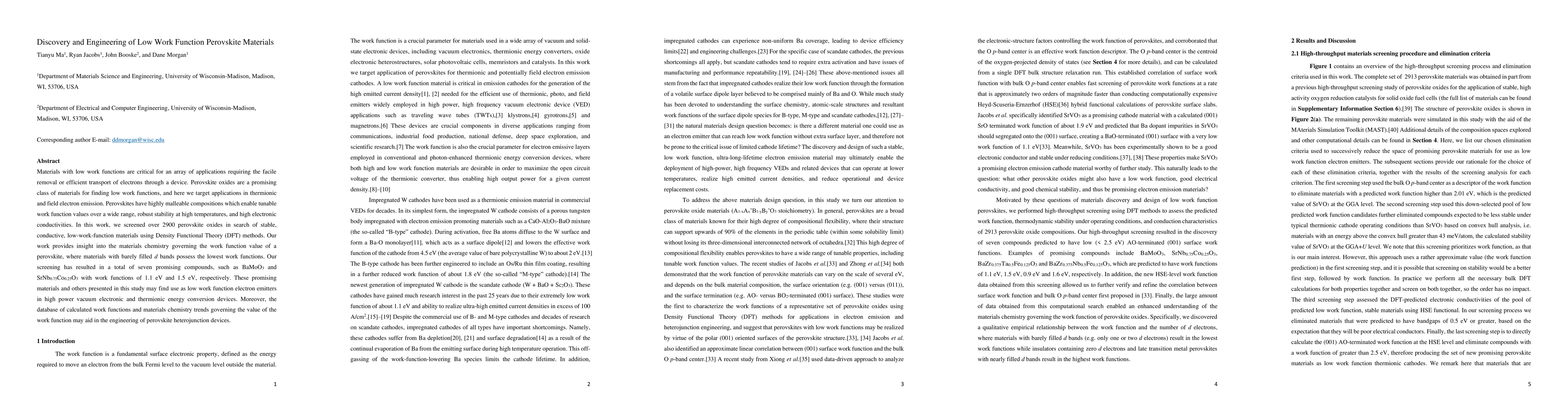 Materials with low work functions are critical for an array of applications requiring the facile removal or efficient transport of electrons through a device. Perovskite oxides are a promising class of materials for finding low work functions, and here we target applications in thermionic and field electron emission. Perovskites have highly malleable compositions which enable tunable work function values over a wide range, robust stability at high temperatures, and high electronic conductivities. In this work, we screened over 2900 perovskite oxides in search of stable, conductive, low-work-function materials using Density Functional Theory (DFT) methods. Our work provides insight into the materials chemistry governing the work function value of a perovskite, where materials with barely filled d bands possess the lowest work functions. Our screening has resulted in a total of seven promising compounds, such as BaMoO3 and SrNb0.75Co0.25O3 with work functions of 1.1 eV and 1.5 eV, respectively. These promising materials and others presented in this study may find use as low work function electron emitters in high power vacuum electronic and thermionic energy conversion devices. Moreover, the database of calculated work functions and materials chemistry trends governing the value of the work function may aid in the engineering of perovskite heterojunction devices.