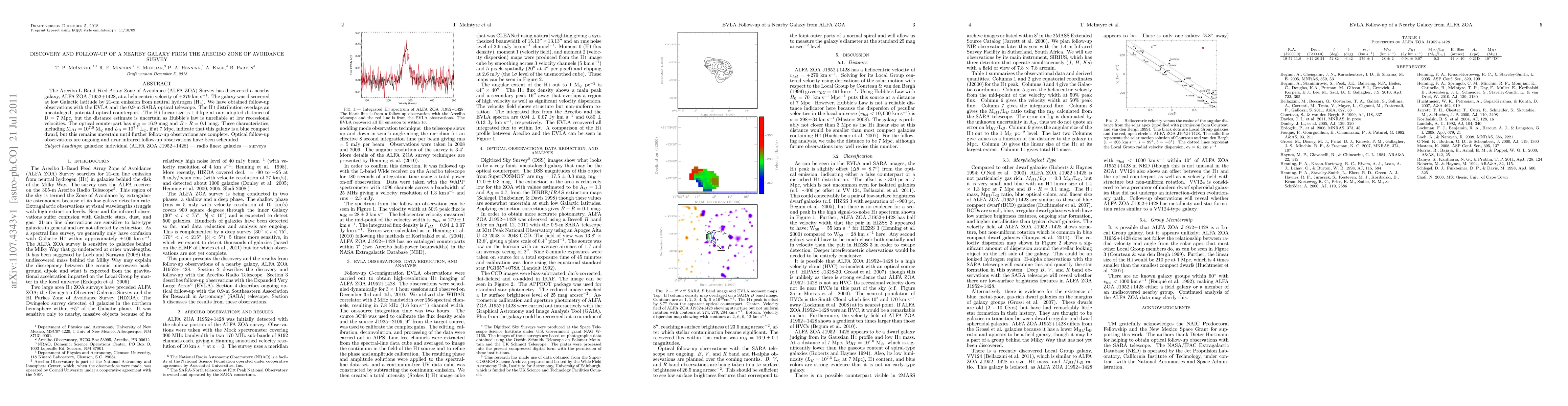 The Arecibo L-Band Feed Array Zone of Avoidance (ALFA ZOA) Survey discovered a nearby galaxy, ALFA ZOA J1952+1428, via 21-cm emission from neutral hydrogen. Follow-up observations suggest it may be a blue compact dwarf, though the distance and classification remain uncertain pending further observations.