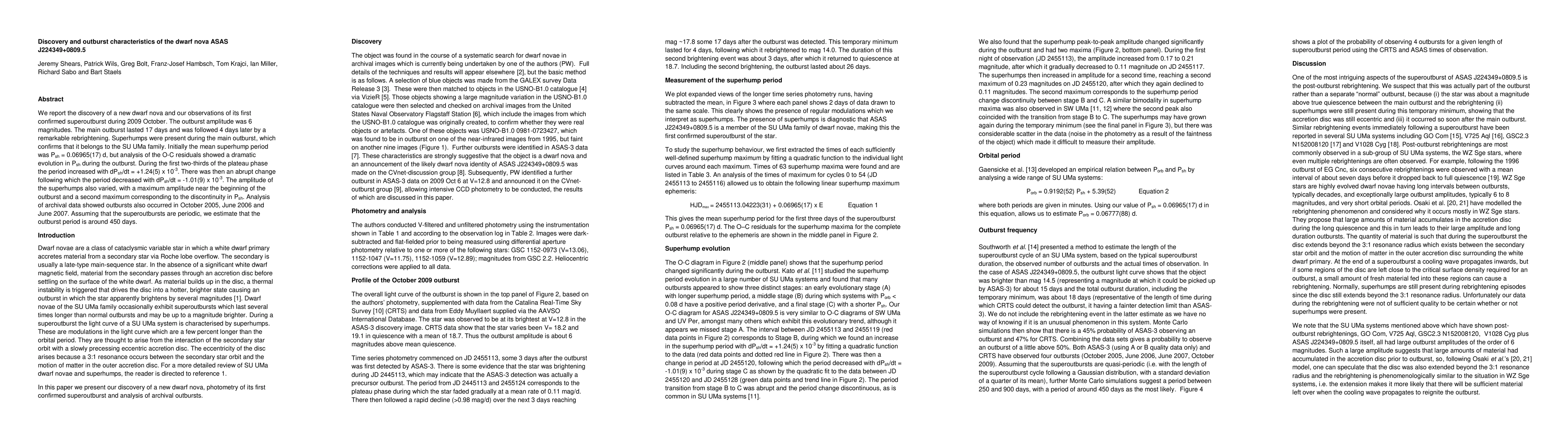 We report the discovery of a new dwarf nova and our observations of its first confirmed superoutburst during 2009 October. The outburst amplitude was 6 magnitudes. The main outburst lasted 17 days and was followed 4 days later by a remarkable rebrightening. Superhumps were present during the main outburst, which confirms that it belongs to the SU UMa family. Initially the mean superhump period was Psh = 0.06965(17) d, but analysis of the O-C residuals showed a dramatic evolution in Psh during the outburst. During the first two-thirds of the plateau phase the period increased with dPsh/dt = +1.24(5) x 10-3. There was then an abrupt change following which the period decreased with dPsh/dt = -1.01(9) x 10-3. The amplitude of the superhumps also varied, with a maximum amplitude near the beginning of the outburst and a second maximum corresponding to the discontinuity in Psh. Analysis of archival data showed outbursts also occurred in October 2005, June 2006 and June 2007. Assuming that the superoutbursts are periodic, we estimate that the outburst period is around 450 days.