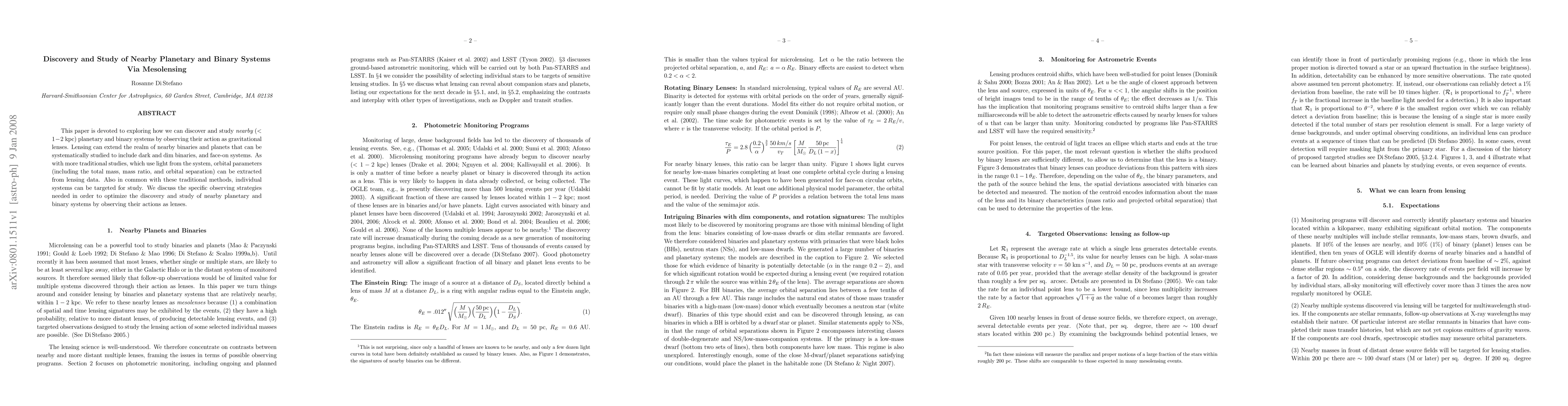 This paper investigates the use of gravitational lensing to discover and study nearby planetary and binary systems, including dark and dim objects, and explores the observing strategies needed to optimize such discoveries. Lensing allows for the extraction of orbital parameters and can target individual systems, similar to traditional methods.