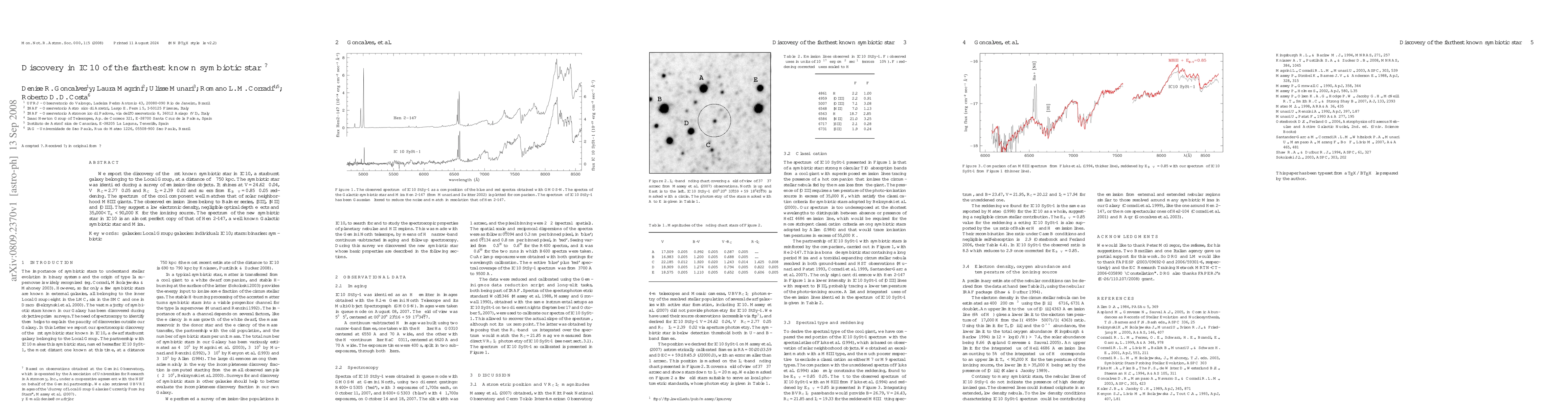 We report the discovery of the first known symbiotic star in IC10, a starburst galaxy belonging to the Local Group, at a distance of ~750kpc. The symbiotic star was identified during a survey of emission-line objects. It shines at V = 24.62+-0.04, V - R_C = 2.77+-0.05 and R_C - I_C = 2.39+-0.02 and suffers from E(B-V) = 0.85+-0.05 reddening. The spectrum of the cool component well matches that of solar neighborhood M8III giants. The observed emission lines belong to Balmer series, [SII], [NII] and [OIII]. They suggest a low electronic density, negligible optical depth effects and 35,000K < T_eff < 90,000K for the ionizing source. The spectrum of the new symbiotic star in IC10 is an almost perfect copy of that of Hen 2-147, a well known Galactic symbiotic star and Mira.