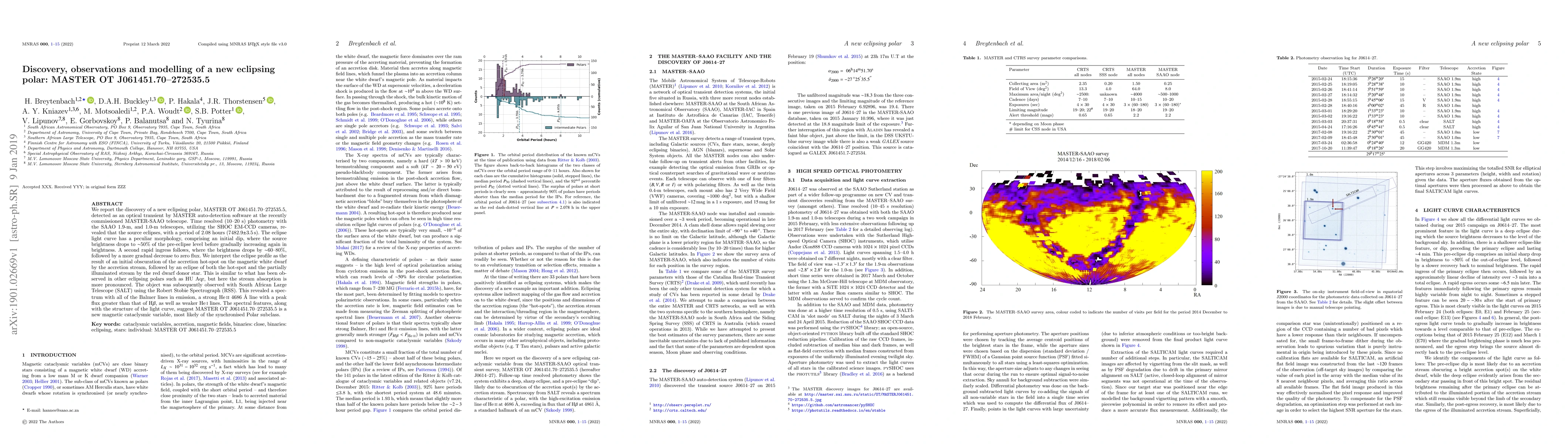 We report the discovery of a new eclipsing polar, MASTER OT J061451.70-272535.5, detected as an optical transient by MASTER auto-detection software at the recently commissioned MASTER-SAAO telescope. Time resolved (10-20 s) photometry with the SAAO 1.9-m, and 1.0-m telescopes, utilizing the SHOC EM-CCD cameras, revealed that the source eclipses, with a period of 2.08 hours (7482.9$\pm$3.5$\,$s). The eclipse light curve has a peculiar morphology, comprising an initial dip, where the source brightness drops to ${\sim}$50% of the pre-eclipse level before gradually increasing again in brightness. A second rapid ingress follows, where the brightness drops by ${\sim}$60-80%, followed by a more gradual decrease to zero flux. We interpret the eclipse profile as the result of an initial obscuration of the accretion hot-spot on the magnetic white dwarf by the accretion stream, followed by an eclipse of both the hot-spot and the partially illuminated stream by the red dwarf donor star. This is similar to what has been observed in other eclipsing polars such as HU Aqr, but here the stream absorption is more pronounced. The object was subsequently observed with South African Large Telescope (SALT) using the Robert Stobie Spectrograph (RSS). This revealed a spectrum with all of the Balmer lines in emission, a strong HeII 4686\AA{} line with a peak flux greater than that of H$\beta$, as well as weaker HeI lines. The spectral features, along with the structure of the light curve, suggest that MASTER OT J061451.70-272535.5 is a new magnetic cataclysmic variable, most likely of the synchronised Polar subclass.