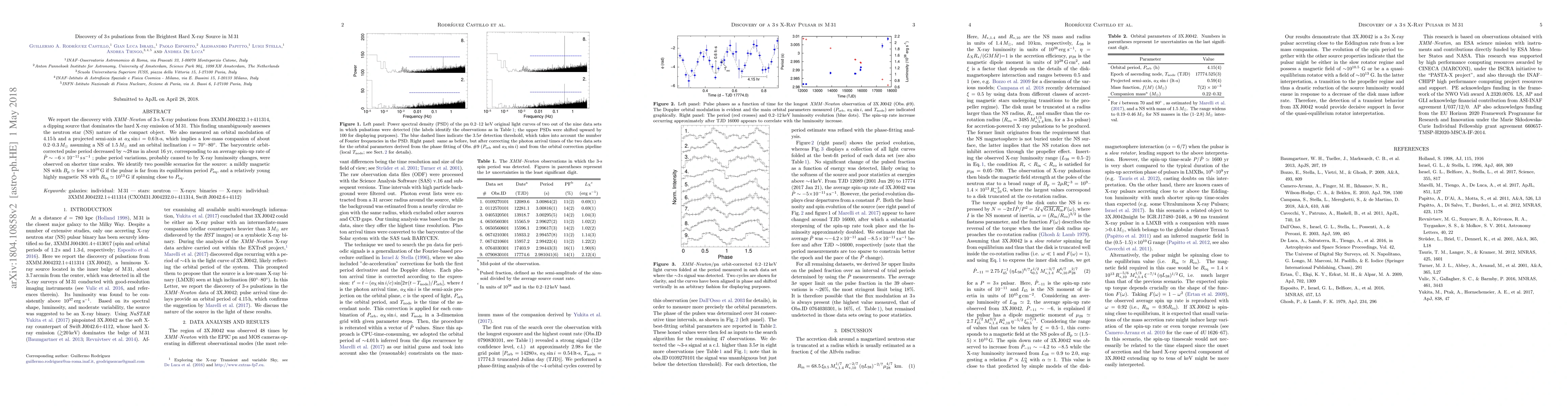 The XMM-Newton discovery of 3-second X-ray pulsations from 3XMM J004232.1+411314 in M31 confirms the neutron star nature of its compact object. The source exhibits an orbital period of 4.15 hours and a low-mass companion, suggesting a spin-up rate of $\sim -6 \times 10^{-11}$ s s$^{-1}$ over 16 years.