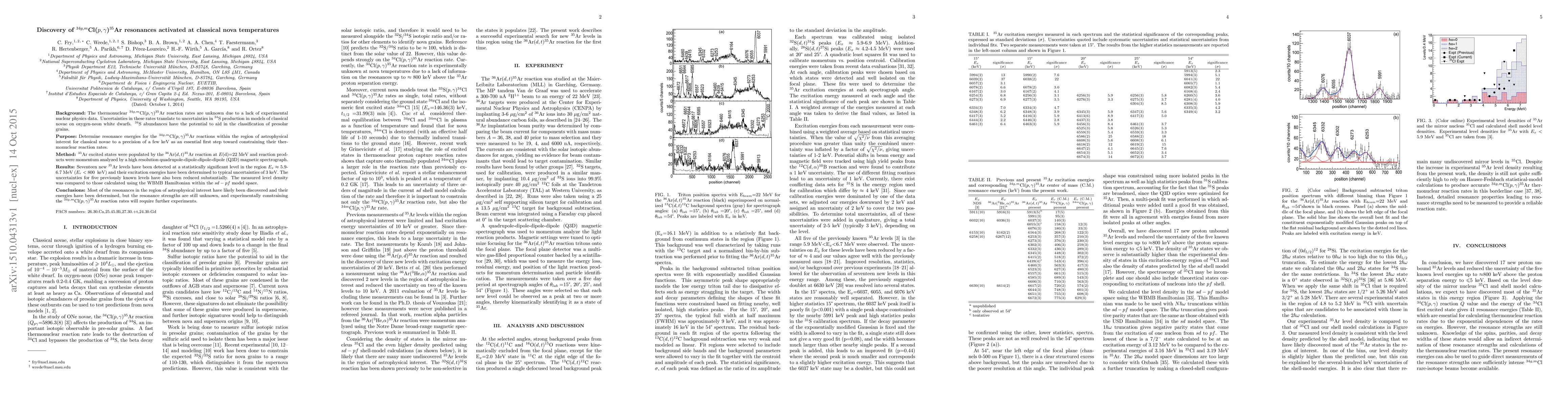 Researchers discovered 17 new resonances in the $^{34g,m}$Cl($p, u$)$^{35}$Ar reaction at energies relevant to classical novae, with excitation energies measured to a precision of 3 keV.