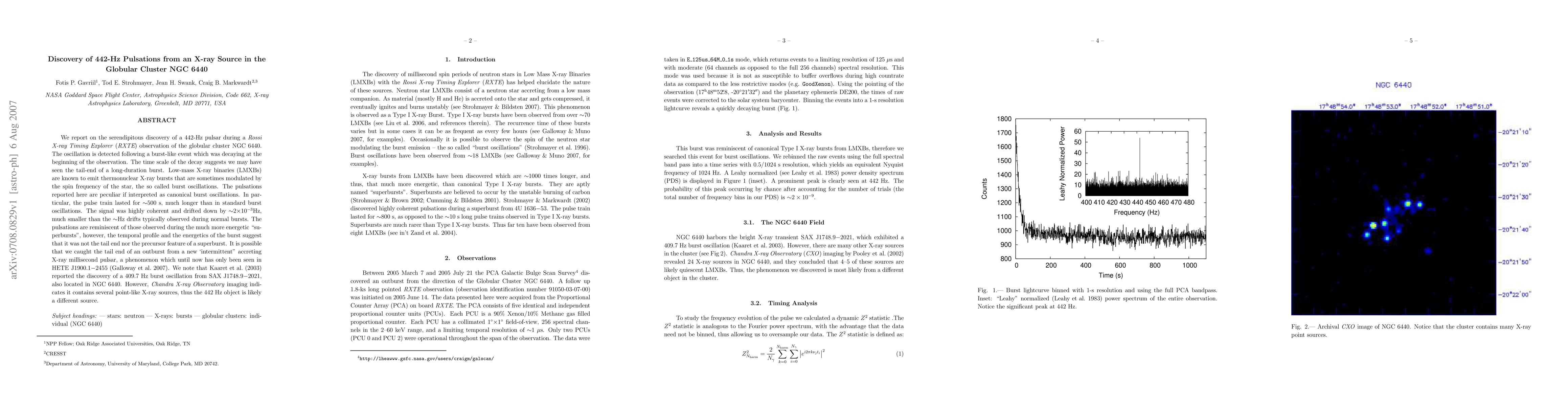 This paper reports the discovery of a 442-Hz pulsar in the globular cluster NGC 6440 during an RXTE observation, characterized by a long-lasting pulse train and minimal frequency drift, suggesting it may be an intermittent accreting X-ray millisecond pulsar. The source differs from previously detected 409.7 Hz oscillations in the same cluster.