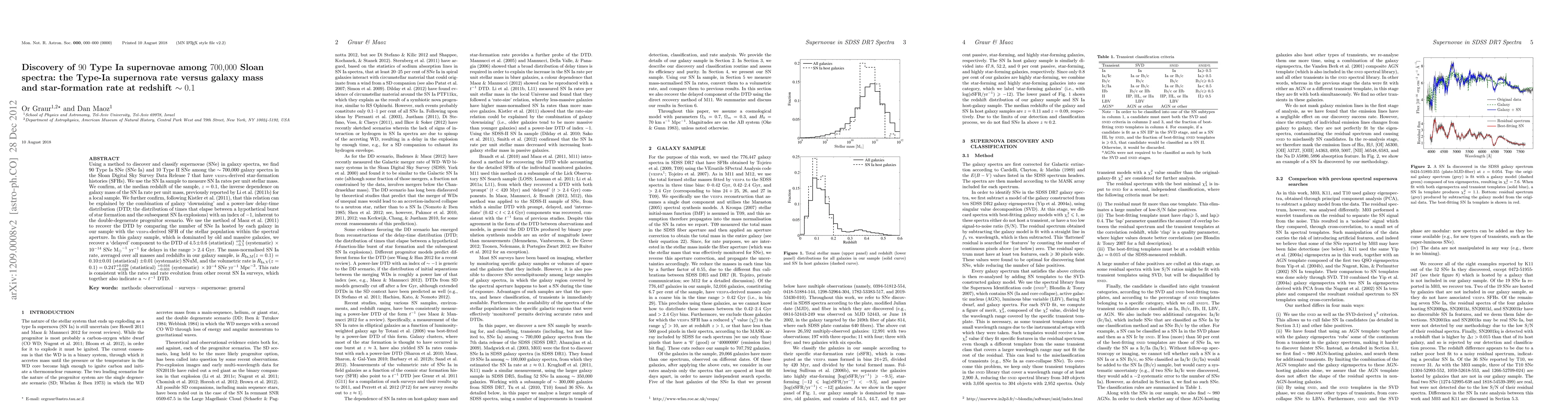 Using a method to discover and classify supernovae (SNe) in galaxy spectra, we find 90 Type Ia SNe (SNe Ia) and 10 Type II SNe among the ~700,000 galaxy spectra in the Sloan Digital Sky Survey Data Release 7 that have VESPA-derived star-formation histories (SFHs). We use the SN Ia sample to measure SN Ia rates per unit stellar mass. We confirm, at the median redshift of the sample, z = 0.1, the inverse dependence on galaxy mass of the SN Ia rate per unit mass, previously reported by Li et al. (2011b) for a local sample. We further confirm, following Kistler et al. (2011), that this relation can be explained by the combination of galaxy "downsizing" and a power-law delay-time distribution (DTD; the distribution of times that elapse between a hypothetical burst of star formation and the subsequent SN Ia explosions) with an index of -1, inherent to the double-degenerate progenitor scenario. We use the method of Maoz et al. (2011) to recover the DTD by comparing the number of SNe Ia hosted by each galaxy in our sample with the VESPA-derived SFH of the stellar population within the spectral aperture. In this galaxy sample, which is dominated by old and massive galaxies, we recover a "delayed" component to the DTD of 4.5 +/- 0.6 (statistical) +0.3 -0.5 (systematic) X 10^-14 SNe Msun^-1 yr^-1 for delays in the range > 2.4 Gyr. The mass-normalized SN Ia rate, averaged over all masses and redshifts in our galaxy sample, is R(Ia,M,z=0.1) = 0.10 +/- 0.01 (statistical) +/- 0.01 (systematic) SNuM, and the volumetric rate is R(Ia,V,z=0.1) = 0.247 +0.029 -0.026 (statistical) +0.016 -0.031 (systematic) X 10^-4 SNe yr^-1 Mpc^-3. This rate is consistent with the rates and rate evolution from other recent SN Ia surveys, which together also indicate a ~t^-1 DTD.