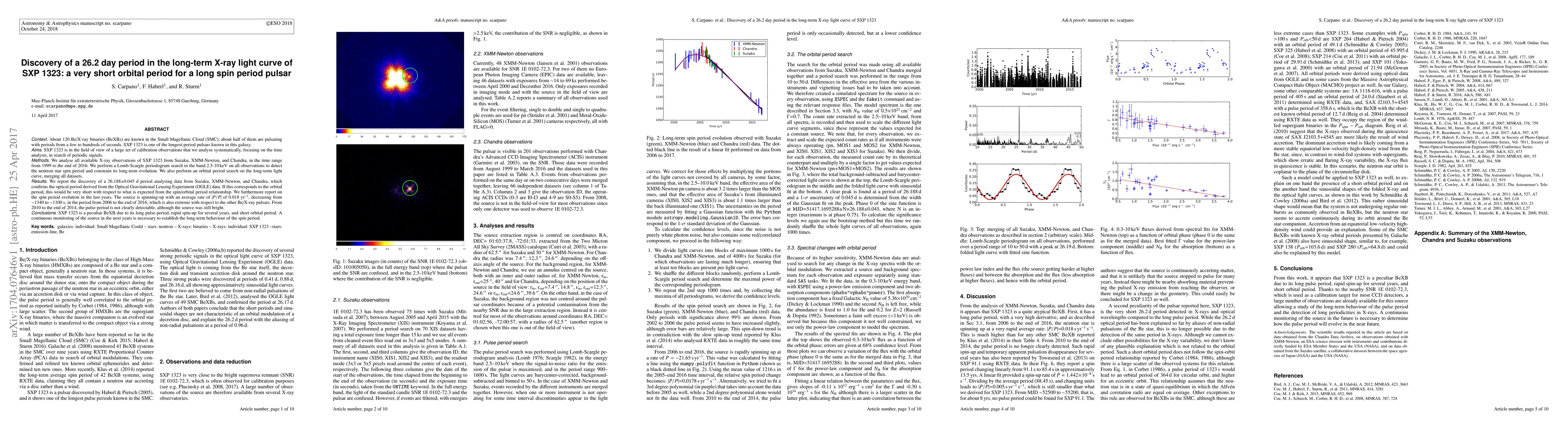 Context. About 120 Be/X-ray binaries (BeXBs) are known in the Small Magellanic Cloud (SMC); about half of them are pulsating with periods from a few to hundreds of seconds. SXP 1323 is one of the longest-period pulsars known in this galaxy. Aims. SXP 1323 is in the field of view of a large set of calibration observations that we analyse systematically, focusing on the time analysis, in search of periodic signals. Methods. We analyse all available X-ray observations of SXP 1323 from Suzaku, XMM-Newton, and Chandra, in the time range from 1999 to the end of 2016. We perform a Lomb-Scargle periodogram search in the band 2.5-10 keV on all observations to detect the neutron star spin period and constrain its long-term evolution. We also perform an orbital period search on the long-term light curve, merging all datasets. Results. We report the discovery of a 26.188+-0.045 d period analysing data from Suzaku, XMM-Newton, and Chandra, which confirms the optical period derived from the Optical Gravitational Lensing Experiment (OGLE) data. If this corresponds to the orbital period, this would be very short with respect to what is expected from the spin/orbital period relationship. We furthermore report on the spin period evolution in the last years. The source is spinning-up with an average rate of Pdot/P of 0.018 yr-1, decreasing from 1340 to 1100 s, in the period from 2006 to the end of 2016, which is also extreme with respect to the other Be/X-ray pulsars. From 2010 to the end of 2014, the pulse period is not clearly detectable, although the source was still bright. Conclusions. SXP 1323 is a peculiar BeXB due to its long pulse period, rapid spin-up for several years, and short orbital period. A continuous monitoring of the source in the next years is necessary to establish the long-term behaviour of the spin period.