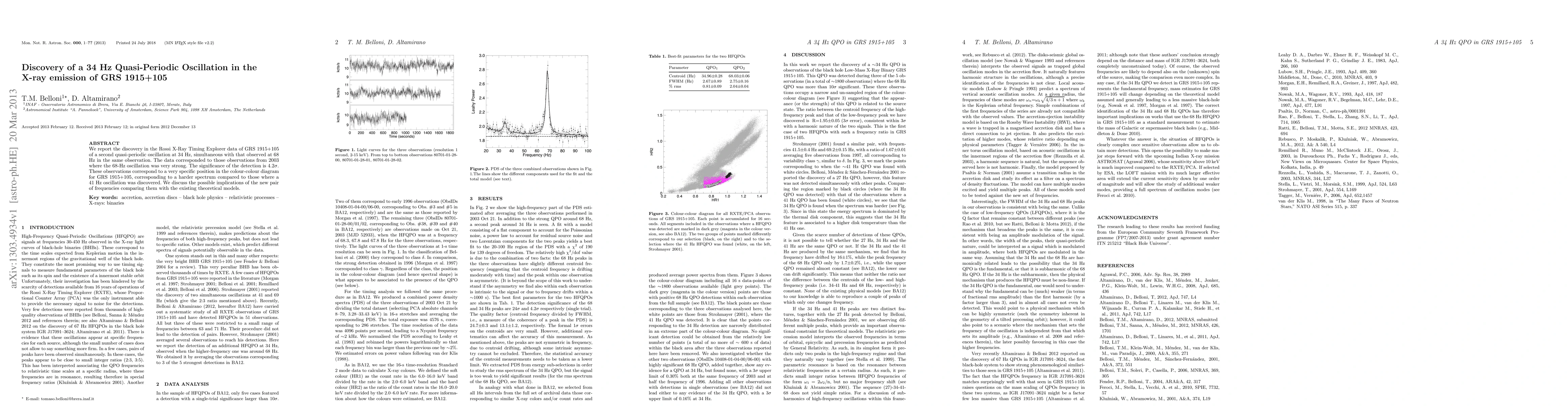 We report the discovery in the Rossi X-Ray Timing Explorer data of GRS 1915+105 of a second quasi-periodic oscillation at 34 Hz, simultaneous with that observed at 68 Hz in the same observation. The data corresponded to those observations from 2003 where the 68-Hz oscillation was very strong. The significance of the detection is 4.2 sigma. These observations correspond to a very specific position in the colour-colour diagram for GRS 1915+105, corresponding to a harder spectrum compared to those where a 41 Hz oscillation was discovered. We discuss the possible implications of the new pair of frequencies comparing them with the existing theoretical models.