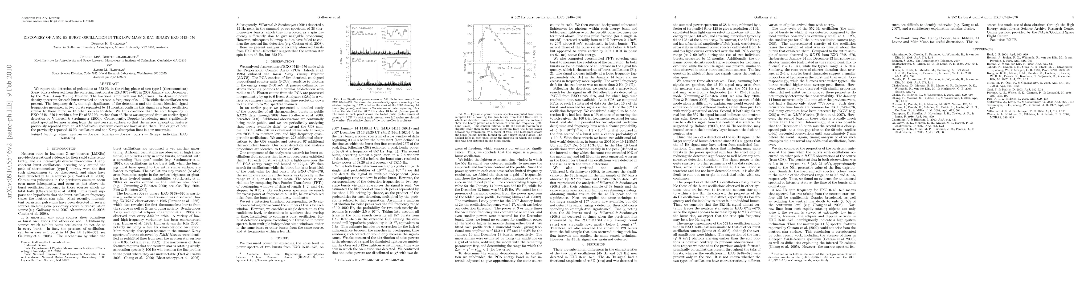 Researchers detected a 552 Hz burst oscillation in the neutron star EXO 0748-676 during two type-I X-ray bursts in 2007, indicating a spin frequency closer to 552 Hz rather than the previously suggested 45 Hz. This discovery challenges the interpretation of earlier spectral features and raises questions about the origin of previous oscillations and absorption lines.