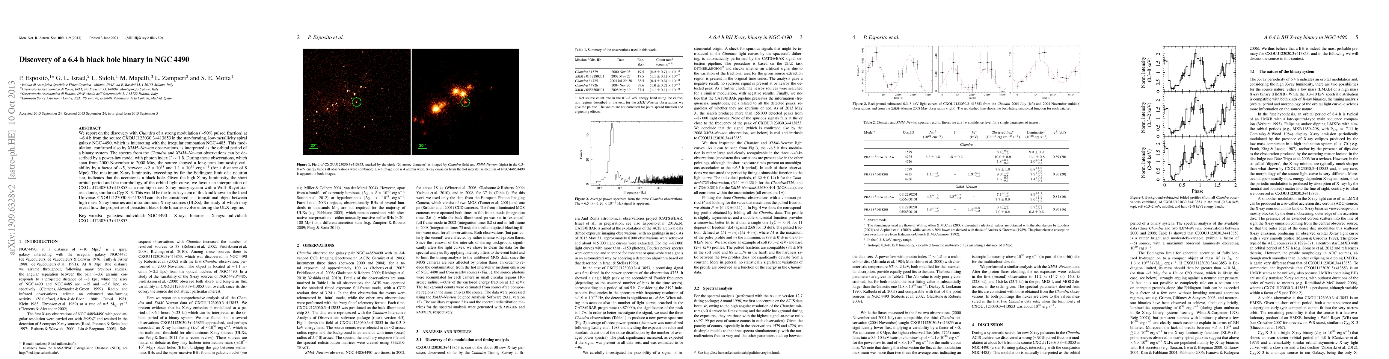 We report on the discovery with Chandra of a strong modulation (~90% pulsed fraction) at ~6.4 h from the source CXOU J123030.3+413853 in the star-forming, low-metallicity spiral galaxy NGC 4490, which is interacting with the irregular companion NGC 4485. This modulation, confirmed also by XMM-Newton observations, is interpreted as the orbital period of a binary system. The spectra from the Chandra and XMM-Newton observations can be described by a power-law model with photon index ~1.5. During these observations, which span from 2000 November to 2008 May, the source showed a long-term luminosity variability by a factor of ~5, between ~2E+38 and 1.1E+39 erg/s (for a distance of 8 Mpc). The maximum X-ray luminosity, exceeding by far the Eddington limit of a neutron star, indicates that the accretor is a black hole. Given the high X-ray luminosity, the short orbital period and the morphology of the orbital light curve, we favour an interpretation of CXOU J123030.3+413853 as a rare high-mass X-ray binary system with a Wolf-Rayet star as a donor, similar to Cyg X-3. This would be the fourth system of this kind known in the local Universe. CXOU J123030.3+413853 can also be considered as a transitional object between high mass X-ray binaries and ultraluminous X-ray sources (ULXs), the study of which may reveal how the properties of persistent black-hole binaries evolve entering the ULX regime.