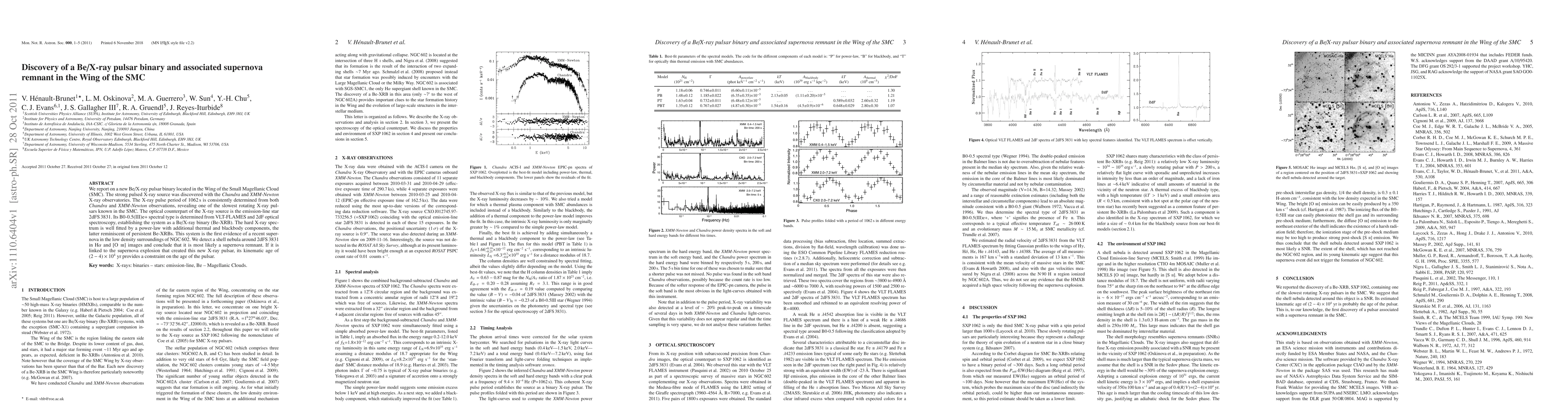 This paper reports the discovery of a new Be/X-ray pulsar binary in the Wing of the Small Magellanic Cloud, identified via Chandra and XMM-Newton X-ray observatories, with a pulse period of 1062 seconds. The optical counterpart is an emission-line star, suggesting a Be-XRB system, and the presence of a shell nebula around it indicates a recent supernova event, likely linked to the pulsar's formation.