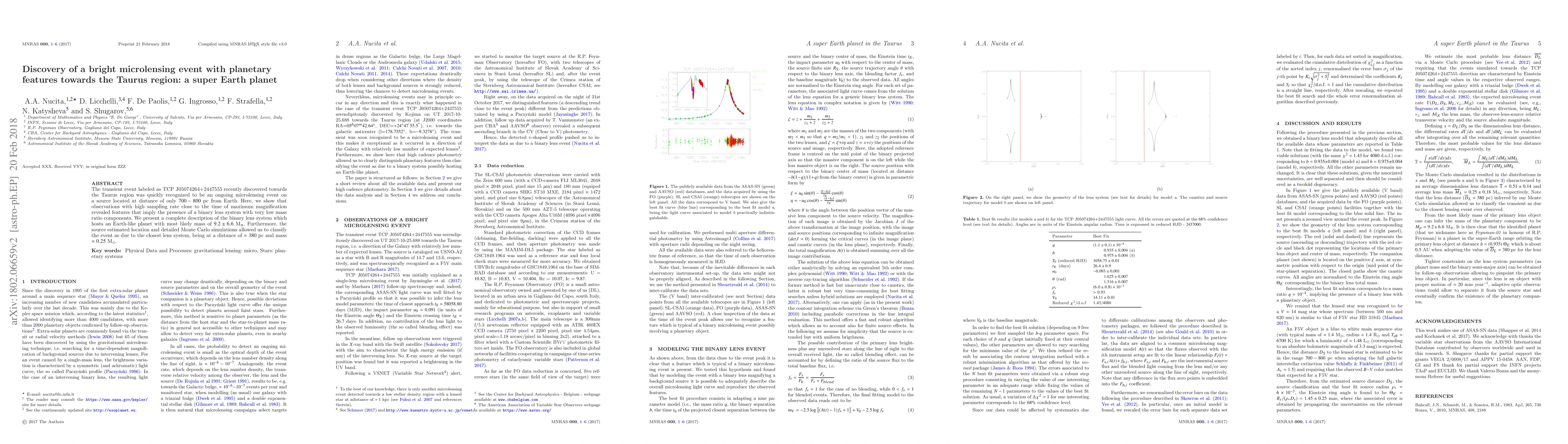 The transient event labeled as TCP J05074264+2447555 recently discovered towards the Taurus region was quickly recognized to be an ongoing microlensing event on a source located at distance of only $700-800$ pc from Earth. Here, we show that observations with high sampling rate close to the time of maximum magnification revealed features that imply the presence of a binary lens system with very low mass ratio components. We present a complete description of the binary lens system which hosts an Earth-like planet with most likely mass of $9.2\pm 6.6$ M$_{\oplus}$. Furthermore, the source estimated location and detailed Monte Carlo simulations allowed us to classify the event as due to the closest lens system, being at a distance of $\simeq 380$ pc and mass $\simeq 0.25$ M$_{\odot}$.