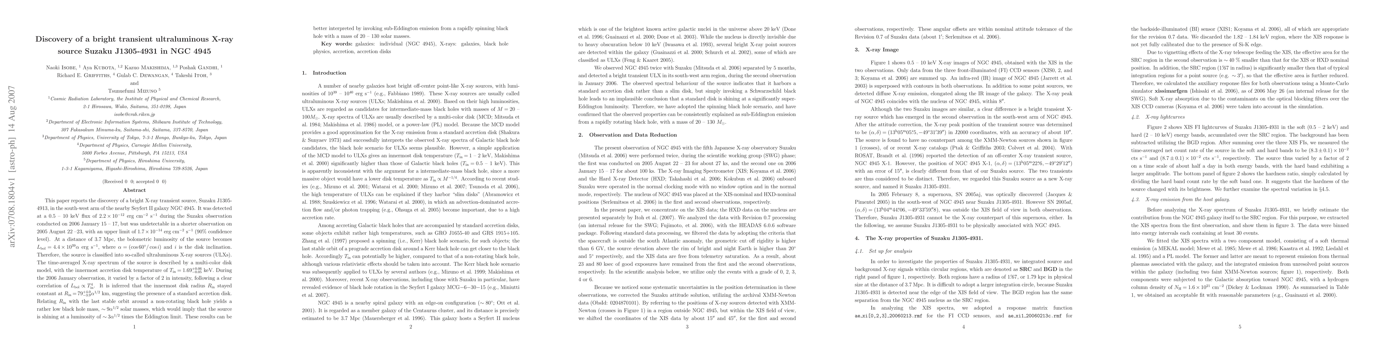 This paper reports the discovery of a bright X-ray transient source, Suzaku J1305-4913, in the south-west arm of the nearby Seyfert II galaxy NGC 4945. It was detected at a 0.5 -- 10 keV flux of $2.2 \times 10^{-12}$ erg cm$^{-2}$ s$^{-1}$ during the Suzaku observation conducted on 2006 January 15 -- 17, but was undetectable in a shorter observation on 2005 August 22 --23, with an upper limit of $1.7 \times 10^{-14}$ erg cm$^{-2}$ s$^{-1}$ (90% confidence level). At a distance of 3.7 Mpc, the bolometric luminosity of the source becomes $L_{\rm bol} = 4.4 \times 10^{39} \alpha$ erg s$^{-1}$, where $\alpha = (\cos 60^\circ / \cos i)$ and $i$ is the disk inclination. Therefore, the source is classified into so-called ultraluminous X-ray sources (ULXs). The time-averaged X-ray spectrum of the source is described by a multi-color disk model, with the innermost accretion disk temperature of $T_{\rm in} = 1.69_{-0.05}^{+0.06}$ keV. During the 2006 January observation, it varied by a factor of 2 in intensity, following a clear correlation of $L_{\rm bol} \propto T_{\rm in}^4$. It is inferred that the innermost disk radius $R_{\rm in}$ stayed constant at $R_{\rm in} = 79_{-3.9}^{+4.0} \alpha^{1/2}$ km, suggesting the presence of a standard accretion disk. Relating $R_{\rm in}$ with the last stable orbit around a non-rotating black hole yields a rather low black hole mass, $\sim 9 \alpha^{1/2}$ solar masses, which would imply that the source is shining at a luminosity of $\sim3 \alpha^{1/2} $ times the Eddington limit. These results can be better interpreted by invoking sub-Eddington emission from a rapidly spinning black hole with a mass of 20 -- 130 solar masses.