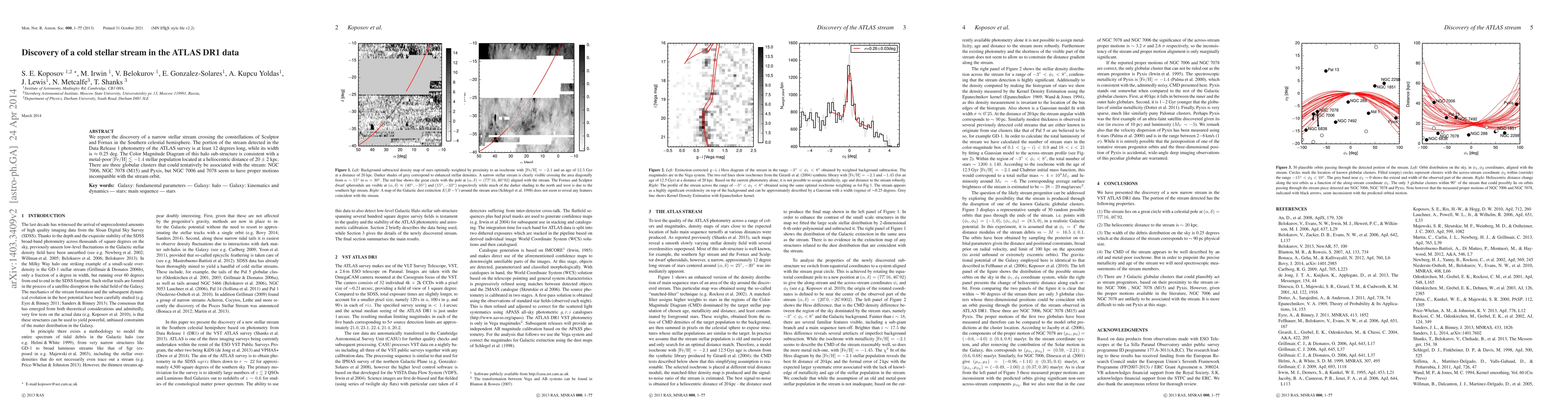 Summary: Researchers discovered a cold stellar stream in the ATLAS DR1 data spanning 12 degrees across Sculptor and Fornax constellations, with a width of 0.25 degrees, indicating a metal-poor population at a distance of 20 ± 2 kpc. Three globular clusters are tentatively linked, though only Pyxis aligns with the stream's orbit.