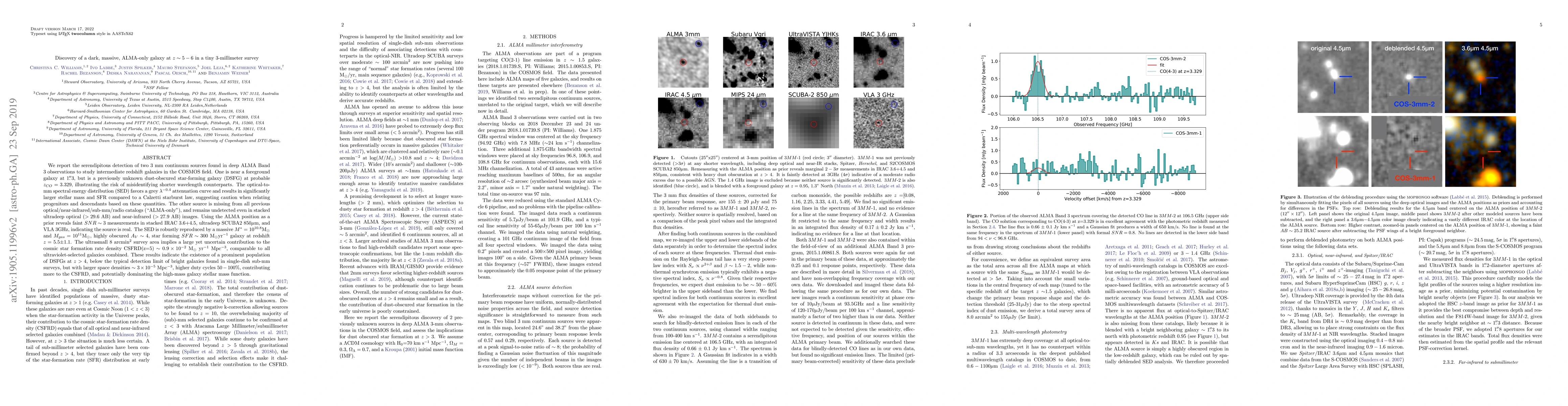 We report the serendipitous detection of two 3 mm continuum sources found in deep ALMA Band 3 observations to study intermediate redshift galaxies in the COSMOS field. One is near a foreground galaxy at 1.3", but is a previously unknown dust-obscured star-forming galaxy (DSFG) at probable $z_{CO}=3.329$, illustrating the risk of misidentifying shorter wavelength counterparts. The optical-to-mm spectral energy distribution (SED) favors a grey $\lambda^{-0.4}$ attenuation curve and results in significantly larger stellar mass and SFR compared to a Calzetti starburst law, suggesting caution when relating progenitors and descendants based on these quantities. The other source is missing from all previous optical/near-infrared/sub-mm/radio catalogs ("ALMA-only"), and remains undetected even in stacked ultradeep optical ($>29.6$ AB) and near-infrared ($>27.9$ AB) images. Using the ALMA position as a prior reveals faint $SNR\sim3$ measurements in stacked IRAC 3.6+4.5, ultradeep SCUBA2 850$\mu$m, and VLA 3GHz, indicating the source is real. The SED is robustly reproduced by a massive $M^*=10^{10.8}$M$_\odot$ and $M_{gas}=10^{11}$M$_\odot$, highly obscured $A_V\sim4$, star forming $SFR\sim300$ M$_{\odot}$yr$^{-1}$ galaxy at redshift $z=5.5\pm$1.1. The ultrasmall 8 arcmin$^{2}$ survey area implies a large yet uncertain contribution to the cosmic star formation rate density CSFRD(z=5) $\sim0.9\times10^{-2}$ M$_{\odot}$ yr$^{-1}$ Mpc$^{-3}$, comparable to all ultraviolet-selected galaxies combined. These results indicate the existence of a prominent population of DSFGs at $z>4$, below the typical detection limit of bright galaxies found in single-dish sub-mm surveys, but with larger space densities $\sim3 \times 10^{-5}$ Mpc$^{-3}$, higher duty cycles $50-100\%$, contributing more to the CSFRD, and potentially dominating the high-mass galaxy stellar mass function.