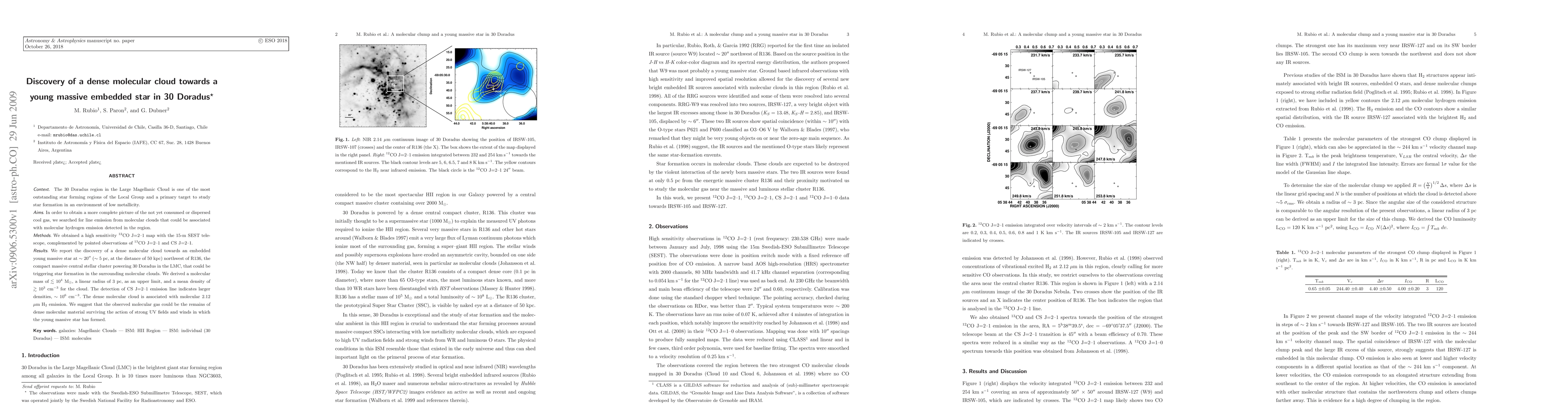 Researchers discovered a dense molecular cloud near a young massive embedded star in the 30 Doradus region of the Large Magellanic Cloud, using high-sensitivity 12CO, 13CO, and CS observations. The cloud, with a mass of $\lesssim 10^4$ \msol and a mean density of $\gtrsim 10^{3}$ cm$^{-3}$, may be triggering star formation and surviving strong UV fields and stellar winds.