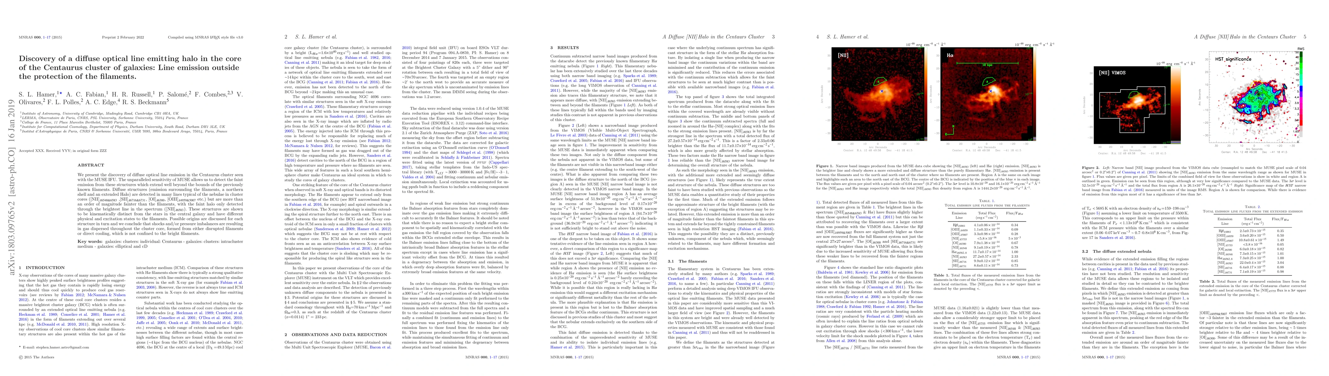 The discovery of diffuse optical line emission in the Centaurus cluster reveals faint structures extending beyond the known filaments, detected via MUSE IFU. These structures, including a northern shell and an extended halo, exhibit different physical and excitation states, suggesting origins from shocks and/or pressure imbalances.