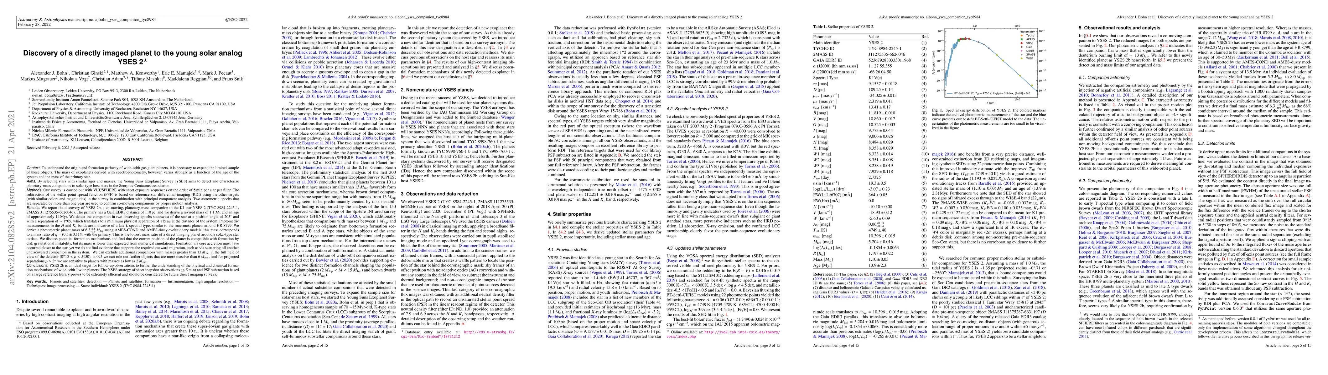 Abbreviated. By selecting stars with similar ages and masses, the Young Suns Exoplanet Survey (YSES) aims to detect and characterize planetary-mass companions to solar-type host stars in the Scorpius-Centaurus association. Our survey is carried out with VLT/SPHERE with short exposure sequences on the order of 5 min per star per filter. The subtraction of the stellar point spread function (PSF) is based on reference star differential imaging (RDI) using the other targets in the survey in combination with principal component analysis. We report the discovery of YSES 2b, a planetary-mass companion to the K1 star YSES 2 (TYC 8984-2245-1). The primary has a Gaia EDR3 distance of 110 pc, and we derive a revised mass of $1.1\,M_\odot$ and an age of approximately 14 Myr. We detect the companion in two observing epochs southwest of the star at a position angle of 205$^\circ$ and with a separation of $\sim1.05''$, which translates to a minimum physical separation of 115 au at the distance of the system. We derive a photometric planet mass of $6.3^{+1.6}_{-0.9}\,M_\mathrm{Jup}$ using AMES-COND and AMES-dusty evolutionary models; this mass corresponds to a mass ratio of $q=(0.5\pm0.1)$% with the primary. This is the lowest mass ratio of a direct imaging planet around a solar-type star to date. We discuss potential formation mechanisms and find that the current position of the planet is compatible with formation by disk gravitational instability, but its mass is lower than expected from numerical simulations. Formation via core accretion must have occurred closer to the star, yet we do not find evidence that supports the required outward migration, such as via scattering off another undiscovered companion in the system. YSES 2b is an ideal target for follow-up observations to further the understanding of the physical and chemical formation mechanisms of wide-orbit Jovian planets.