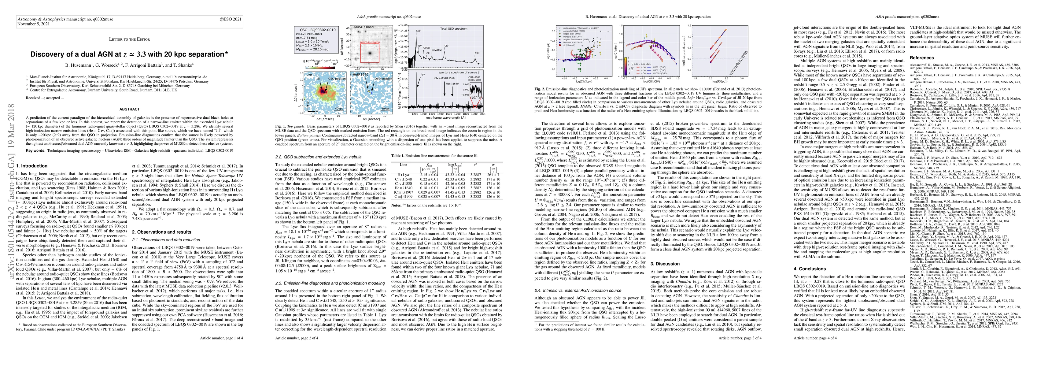 Astronomers have discovered a rare dual active galaxy nucleus (AGN) system 20kpc away from a luminous quasar at z=3.286, providing evidence against the current paradigm of hierarchical galaxy assembly.